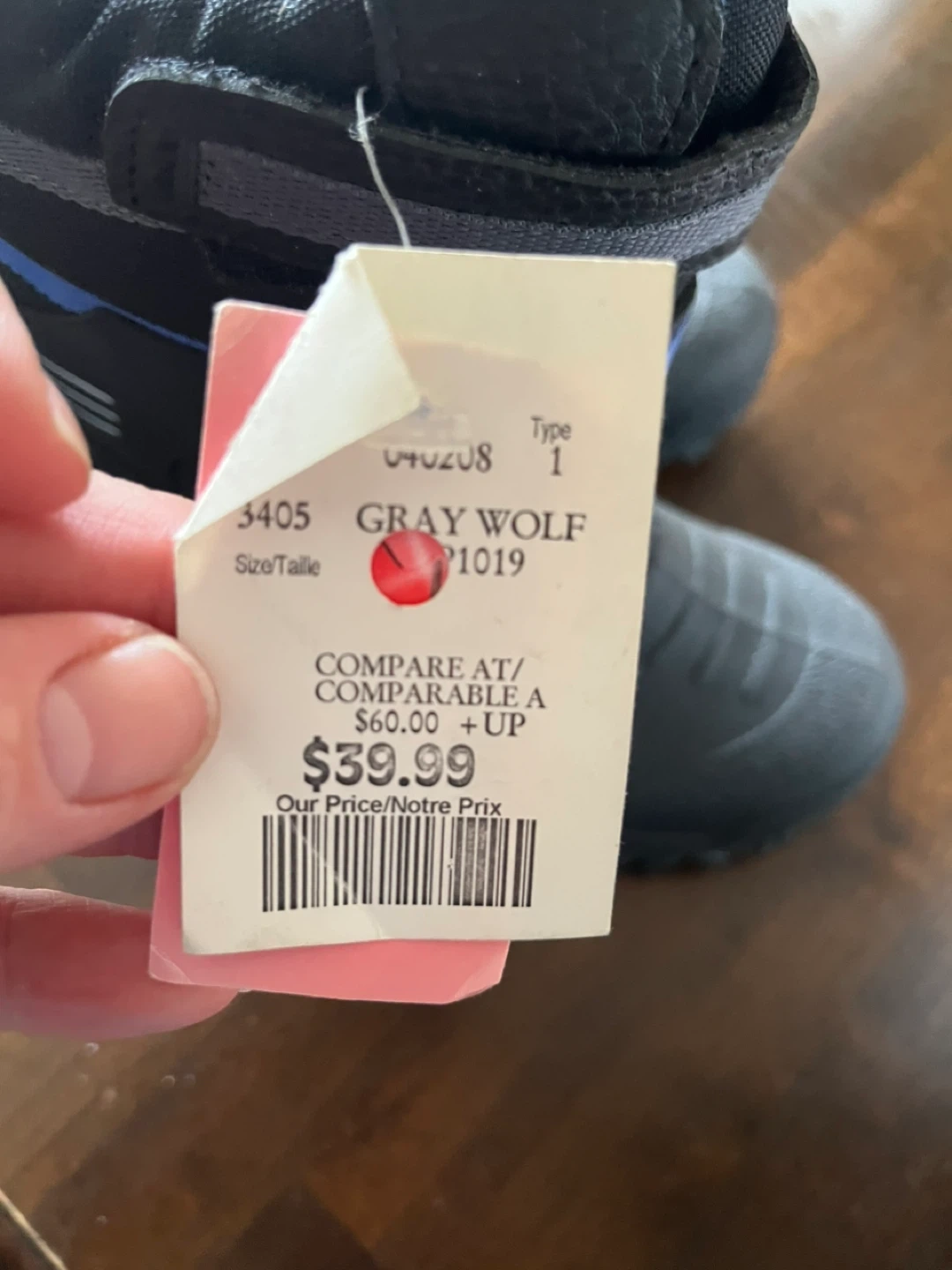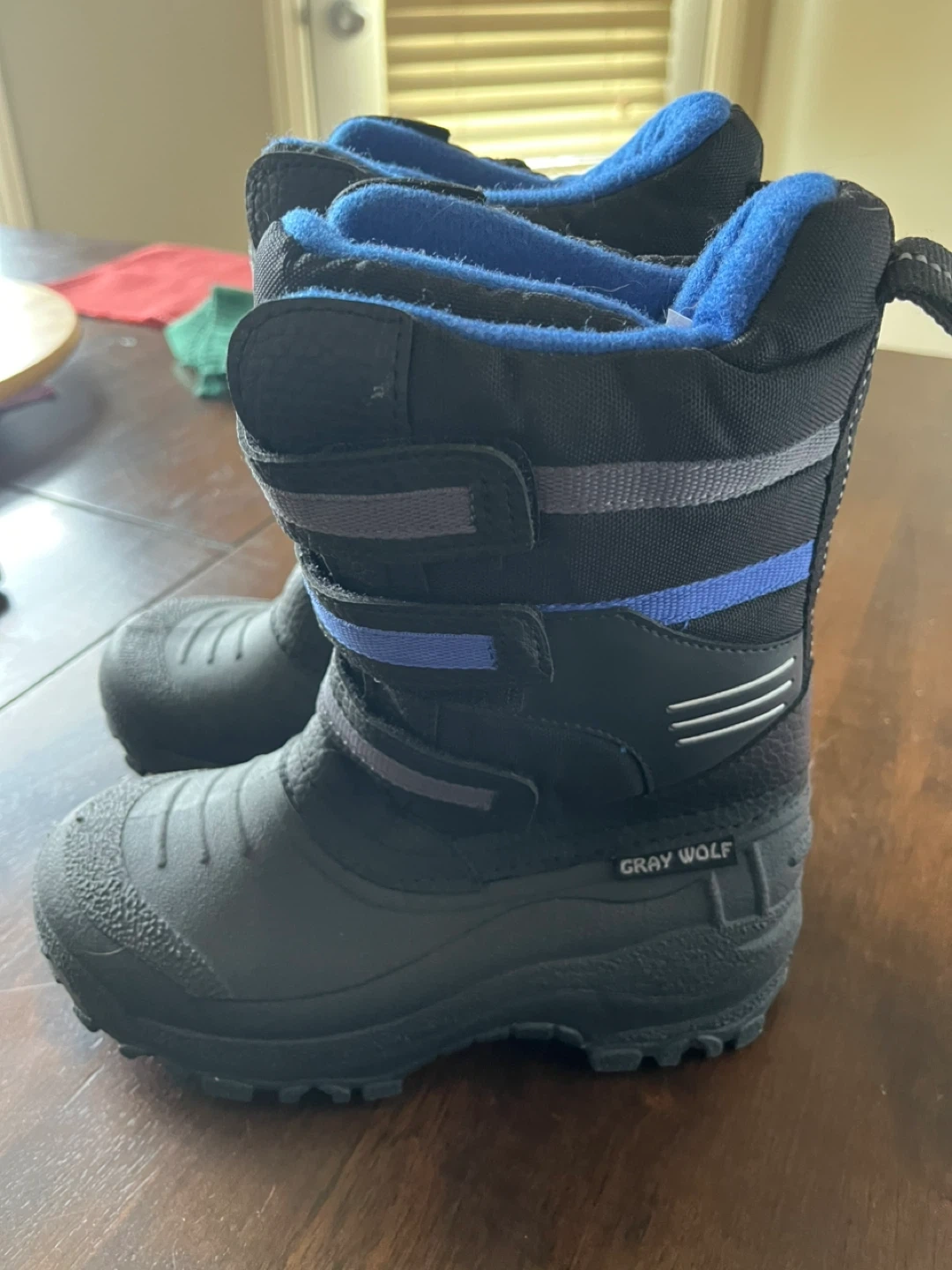 Black Gray Wolf winter boots for kids. Features adjustable straps for a secure fit. These boots are made for cold weather. Size is 1.
