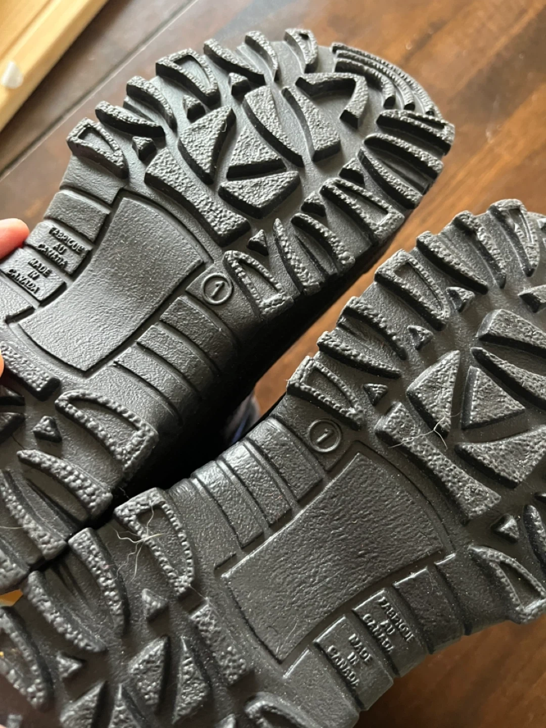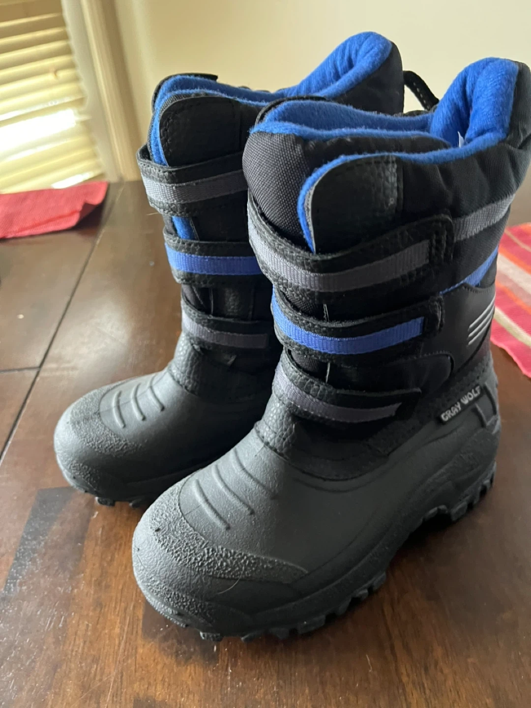 Black Gray Wolf winter boots for kids. Features adjustable straps for a secure fit. These boots are made for cold weather. Size is 1.