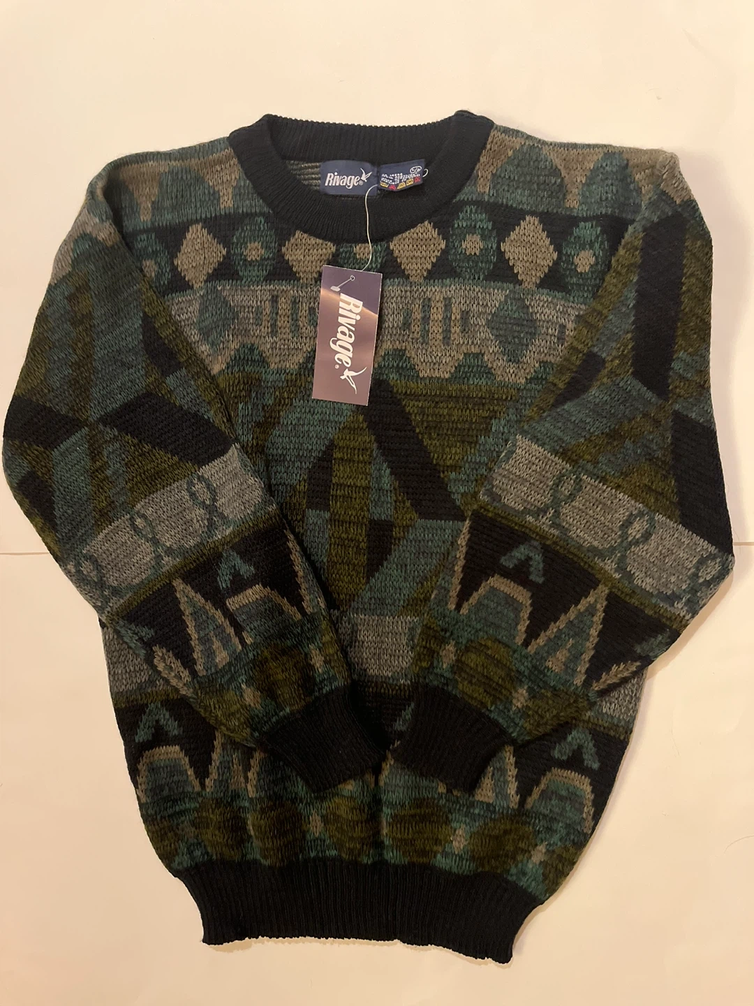 This is a Rivage knit sweater with a geometric pattern. It's a size medium. The material appears to be acrylic.