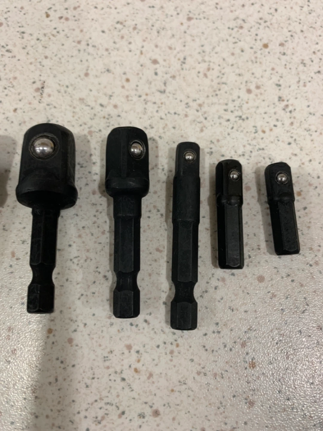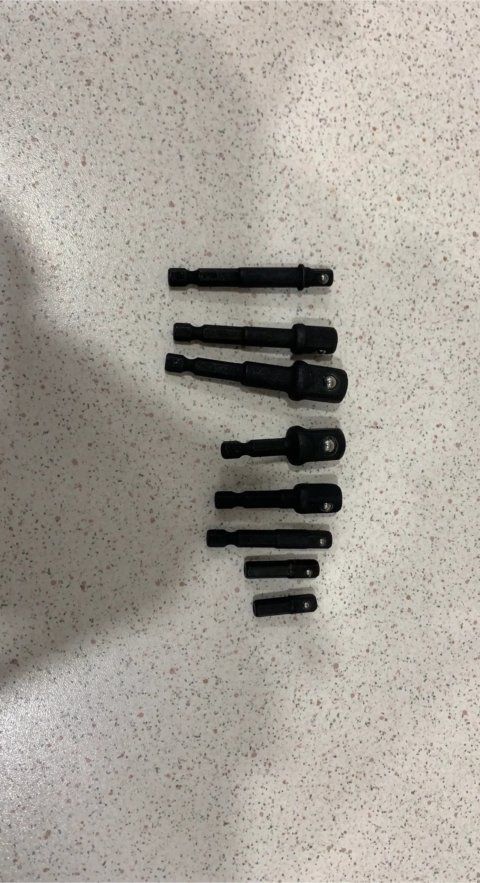 This is a set of 8 black socket adapter extensions. They appear to be made of metal and come in various sizes. These adapters are useful for reaching fasteners in tight spaces.