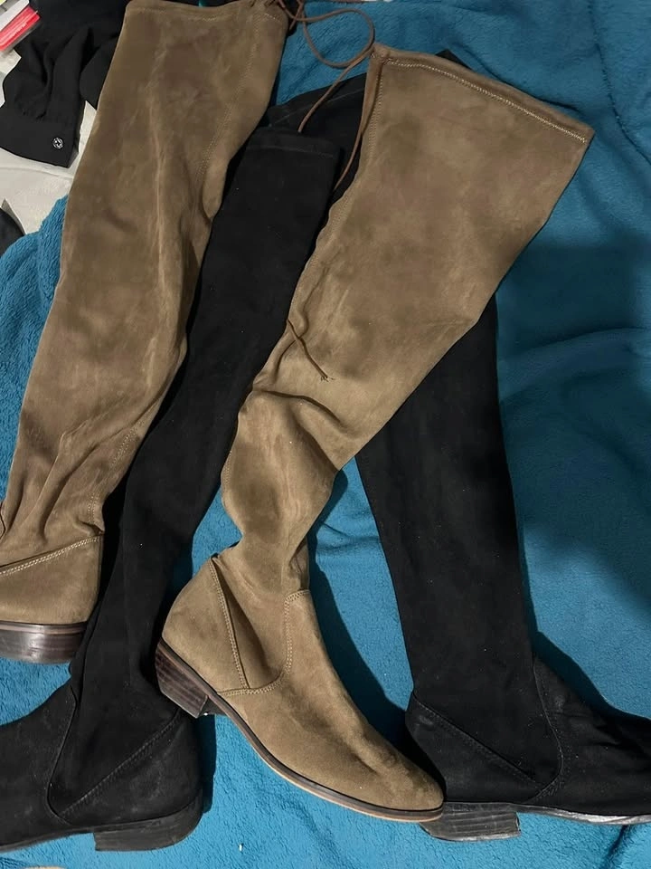 Hi ladies, please see my used shoes for sale. All are size 9. Black tall boot - $20, Brown tall boot - $40, Black platforms - $30, Mint green platforms - $30, Gold kicks - $25.