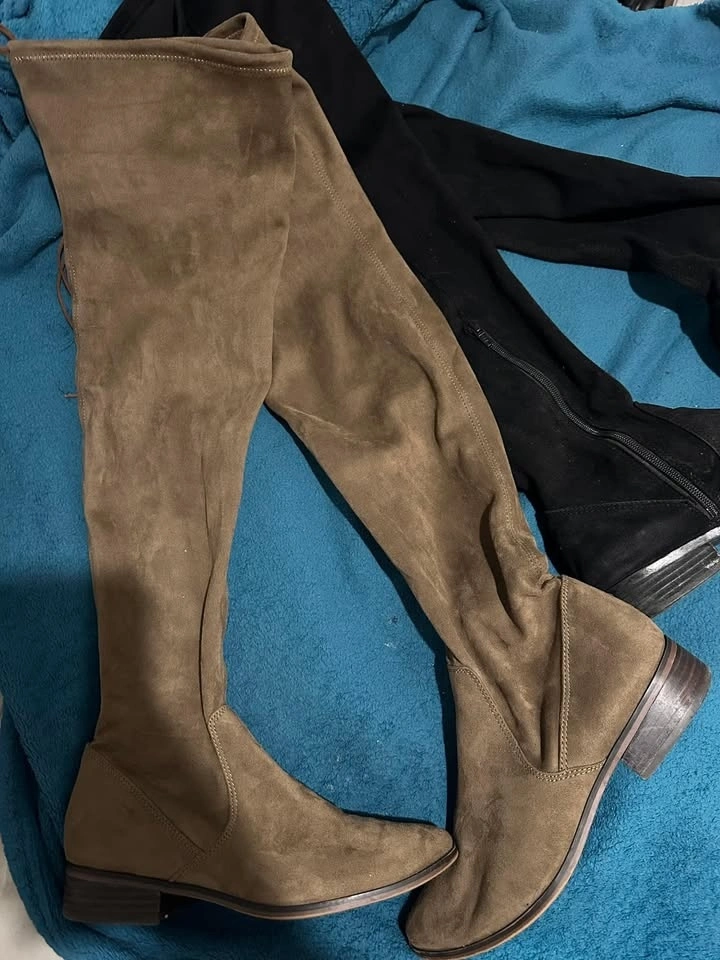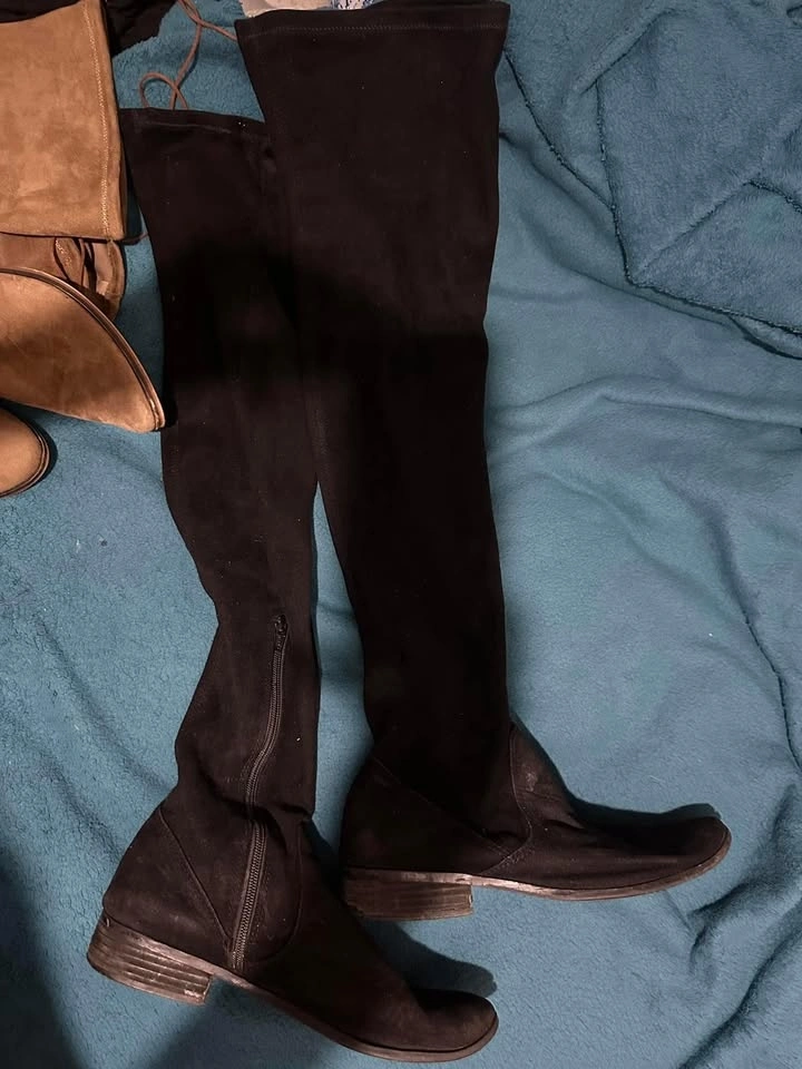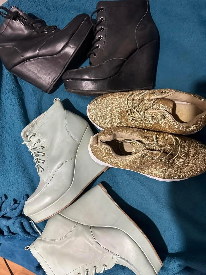 Hi ladies, please see my used shoes for sale. All are size 9. Black tall boot - $20, Brown tall boot - $40, Black platforms - $30, Mint green platforms - $30, Gold kicks - $25.