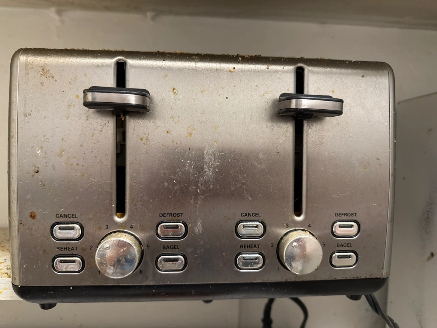 This is a stainless steel 4-slice toaster. It has settings for cancel, defrost, reheat, and bagel functions. The browning level is adjustable from 1 to 6.