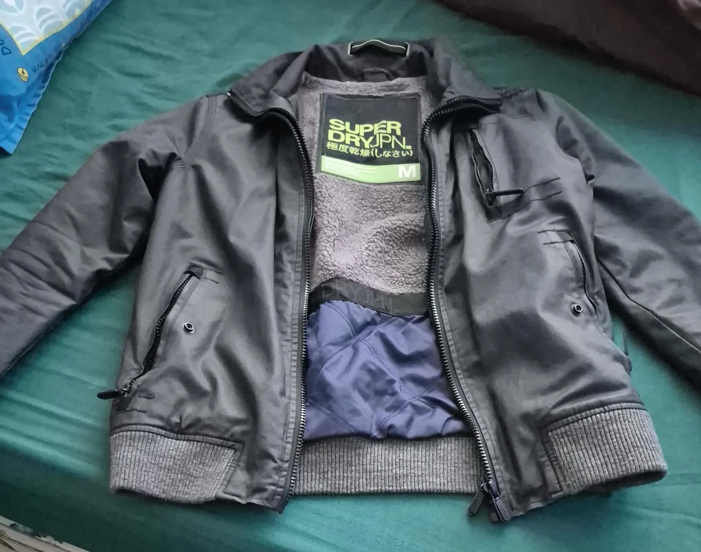 This is a Superdry Moody Norse Bomber jacket in a size medium. It features a grey faux leather exterior with a warm, fluffy grey lining. The jacket also has quilted blue lining in the lower section and ribbed cuffs and hem.