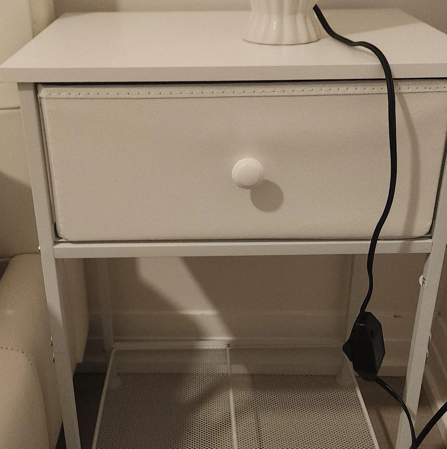 White bedside table with one drawer and an open metal shelf below. It's a simple and functional storage piece. Handy for small spaces or beside a bed.