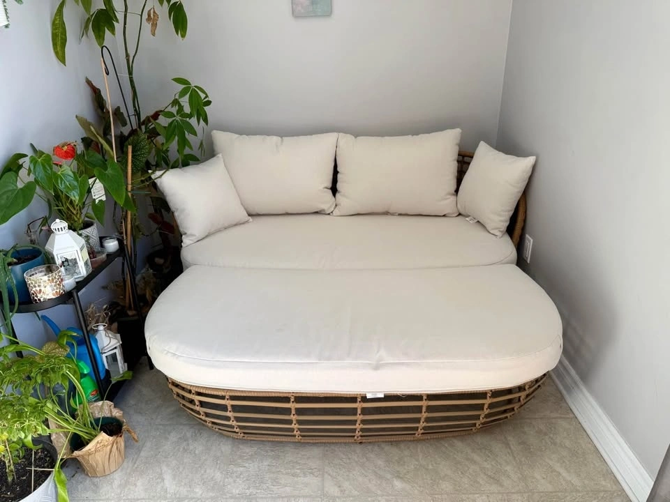 Hometrends Dune 2-Piece Patio Loveseat & Ottoman in Taupe. Can be used as a sofa or daybed. Excellent condition, purchased last year and only used indoors a few times. Selling because I need the space for a home office. The all-weather design features handwoven resin wicker wrapped around heavy-duty, rust-resistant steel frames. Includes UV-resistant cushions. Pet-free, smoke-free home. Pick up in Orleans on Esprit Drive. Welcome to see before purchase.