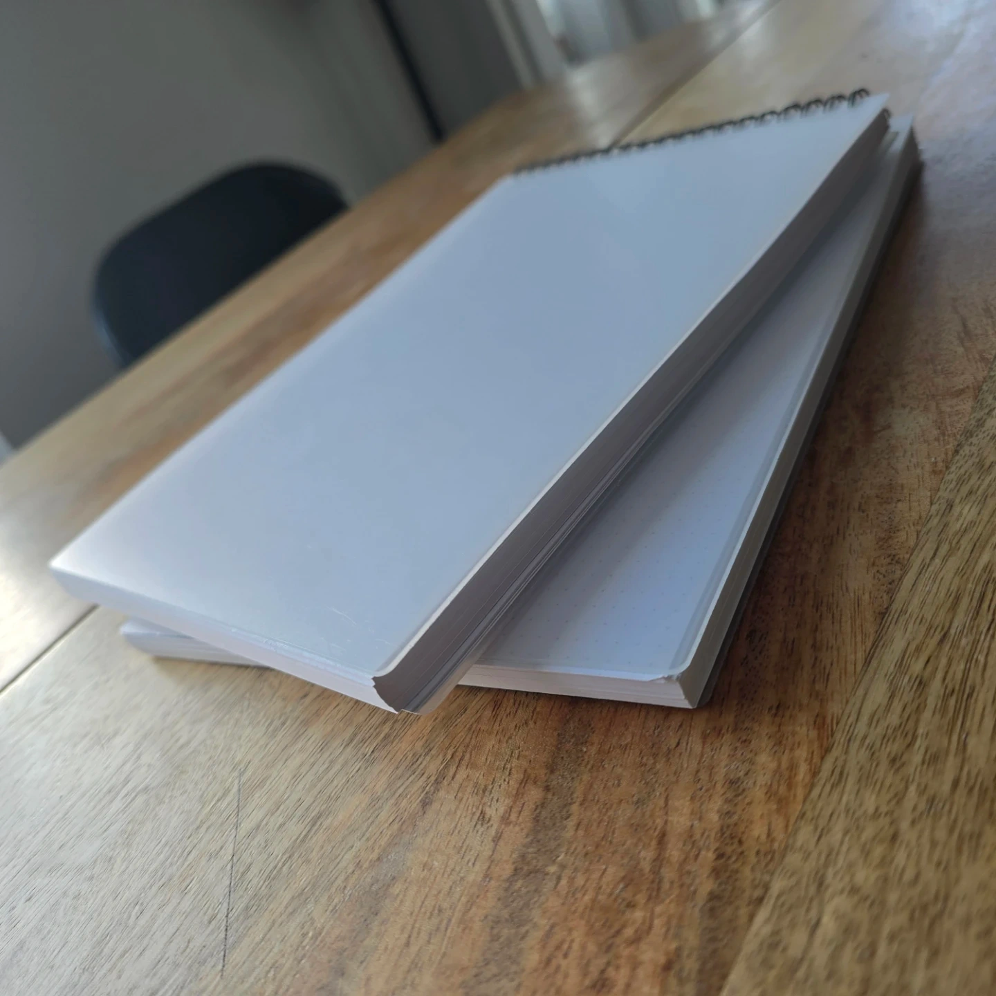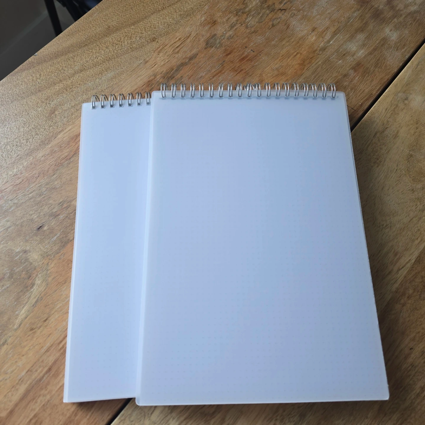 Two spiral-bound notebooks with dot grid pages and clear plastic covers. They're perfect for journaling, sketching, or note-taking. Paper is white with a subtle grey dot pattern. Each notebook is bound with a silver metal spiral. 7in ×10in.