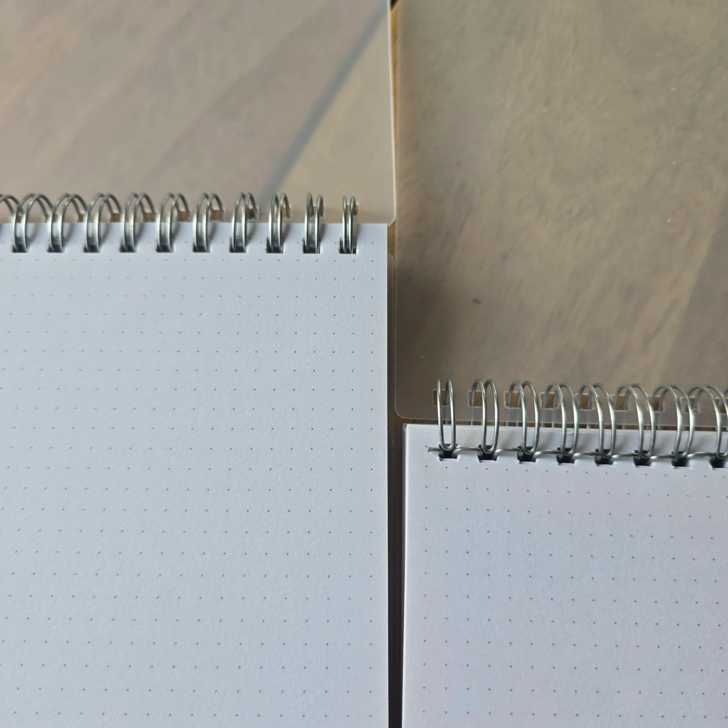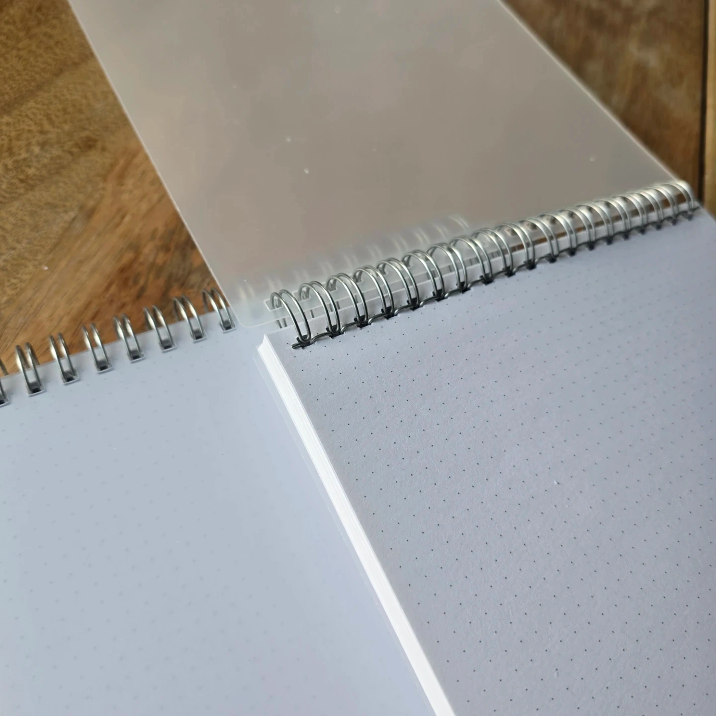 Two spiral-bound notebooks with dot grid pages and clear plastic covers. They're perfect for journaling, sketching, or note-taking. Paper is white with a subtle grey dot pattern. Each notebook is bound with a silver metal spiral. 7in ×10in.
