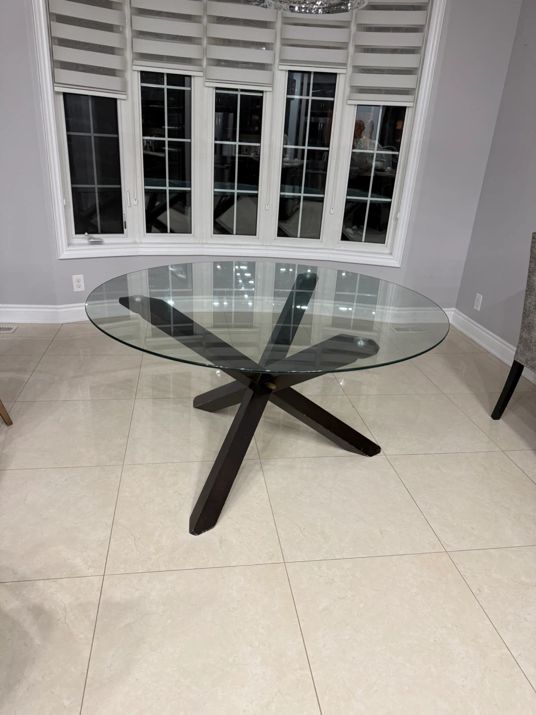 This dining table features a sleek, clear glass top with a striking dark wood base. The unique X-shaped pedestal provides sturdy support. It's suitable for a dining room or kitchen nook. Measures approximately 48 inches in diameter.