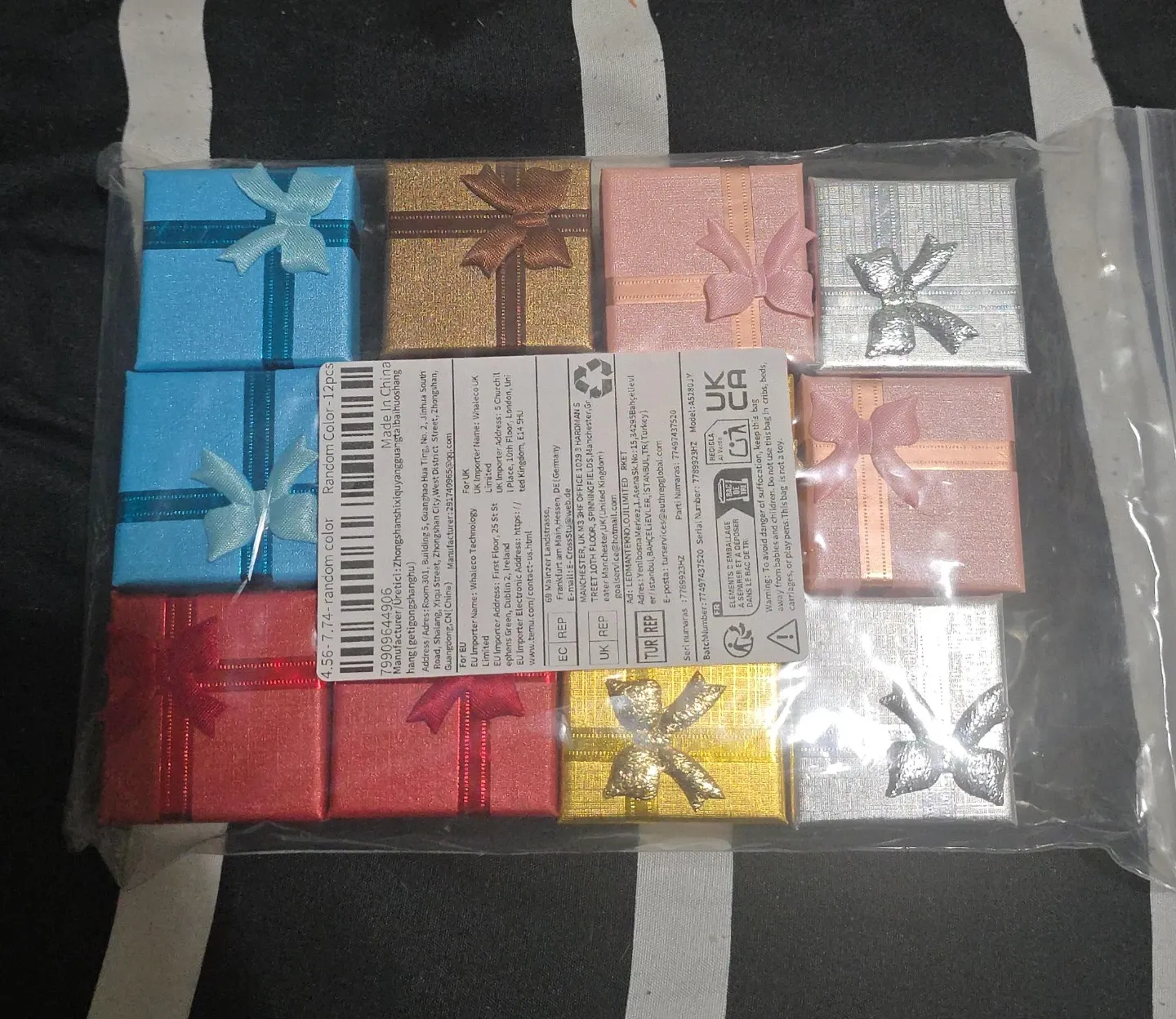 Set of 12 small gift boxes. Each box comes with a decorative ribbon. Available in assorted colours, perfect for small gifts or favours.