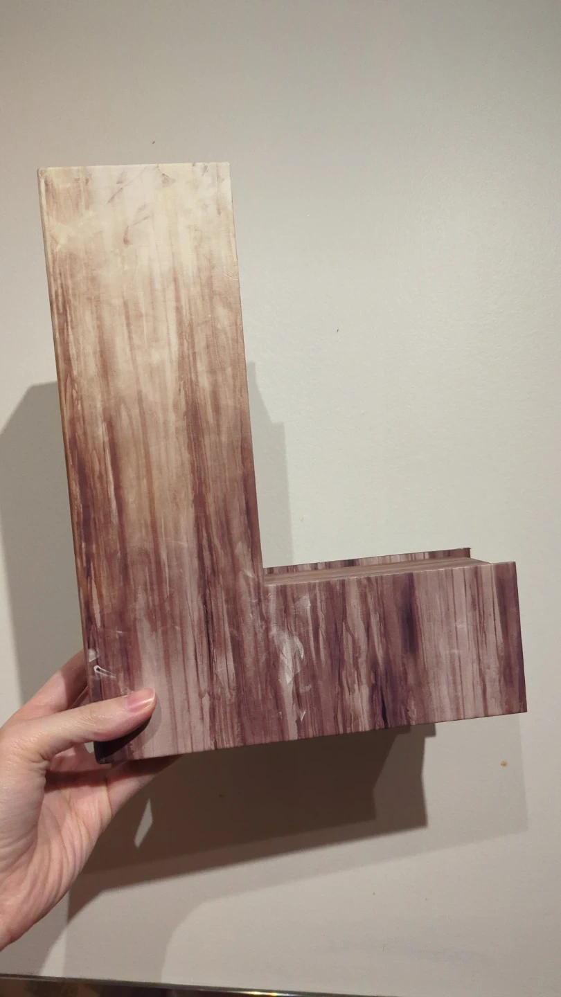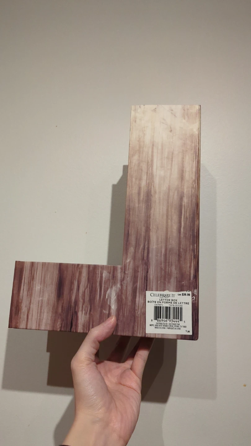 This letter box features a wood grain design. It's perfect for organizing small items or for decorative purposes. The box has a unique L-shape.