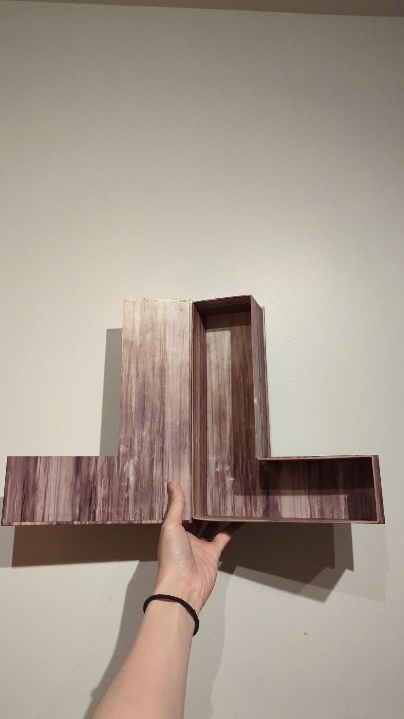 This letter box features a wood grain design. It's perfect for organizing small items or for decorative purposes. The box has a unique L-shape.