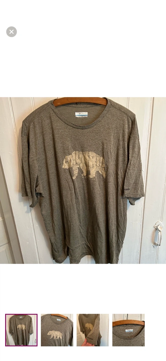 Two Columbia graphic t-shirts, one red with a mountain scene and one khaki with a bear. Both are short-sleeved with crew necks. Great for casual wear!