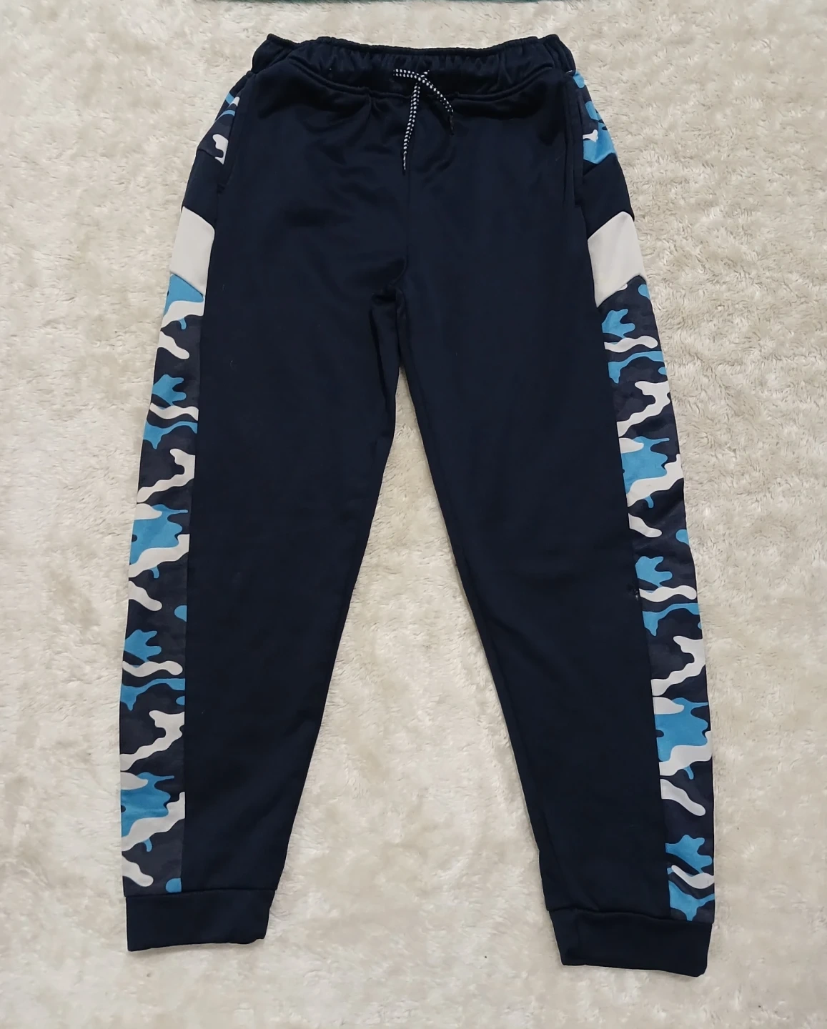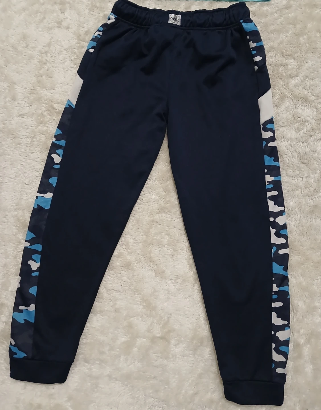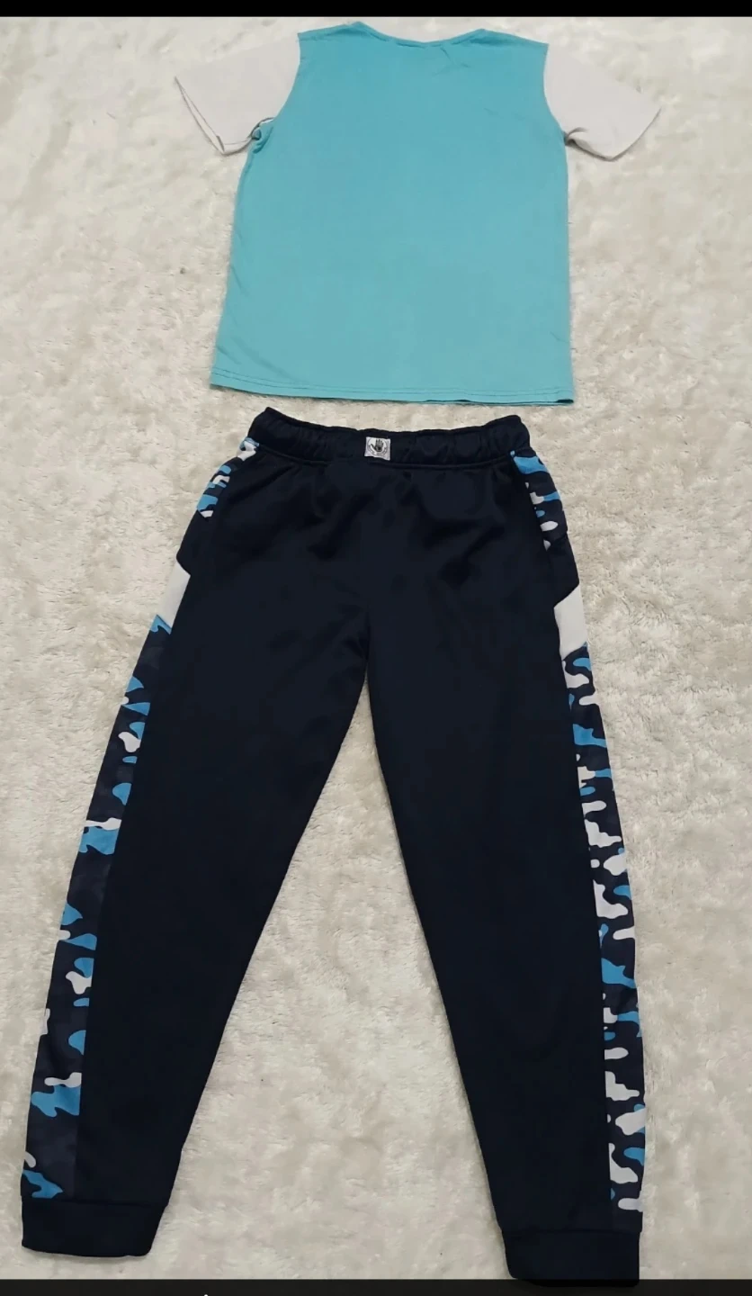The Champion t-shirt is a teal and white colour. The track pants are navy blue with camouflage accents, Perfect for everyday wear