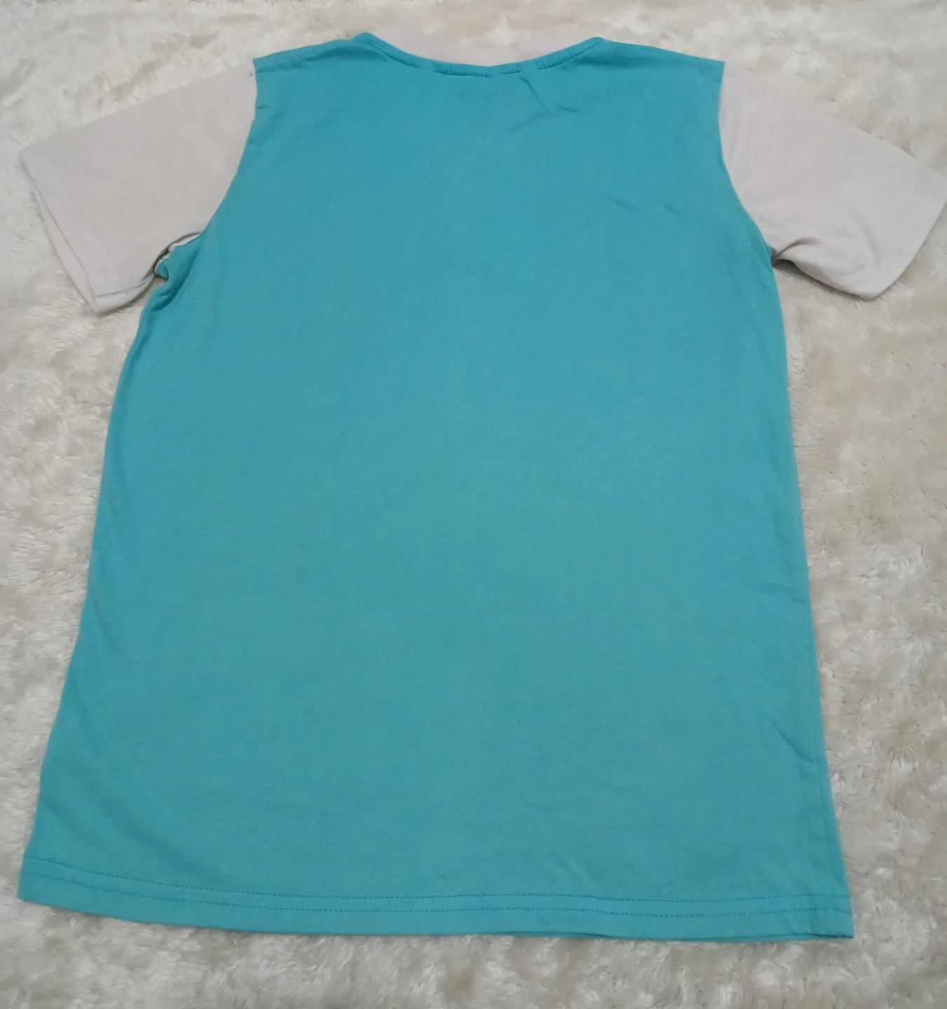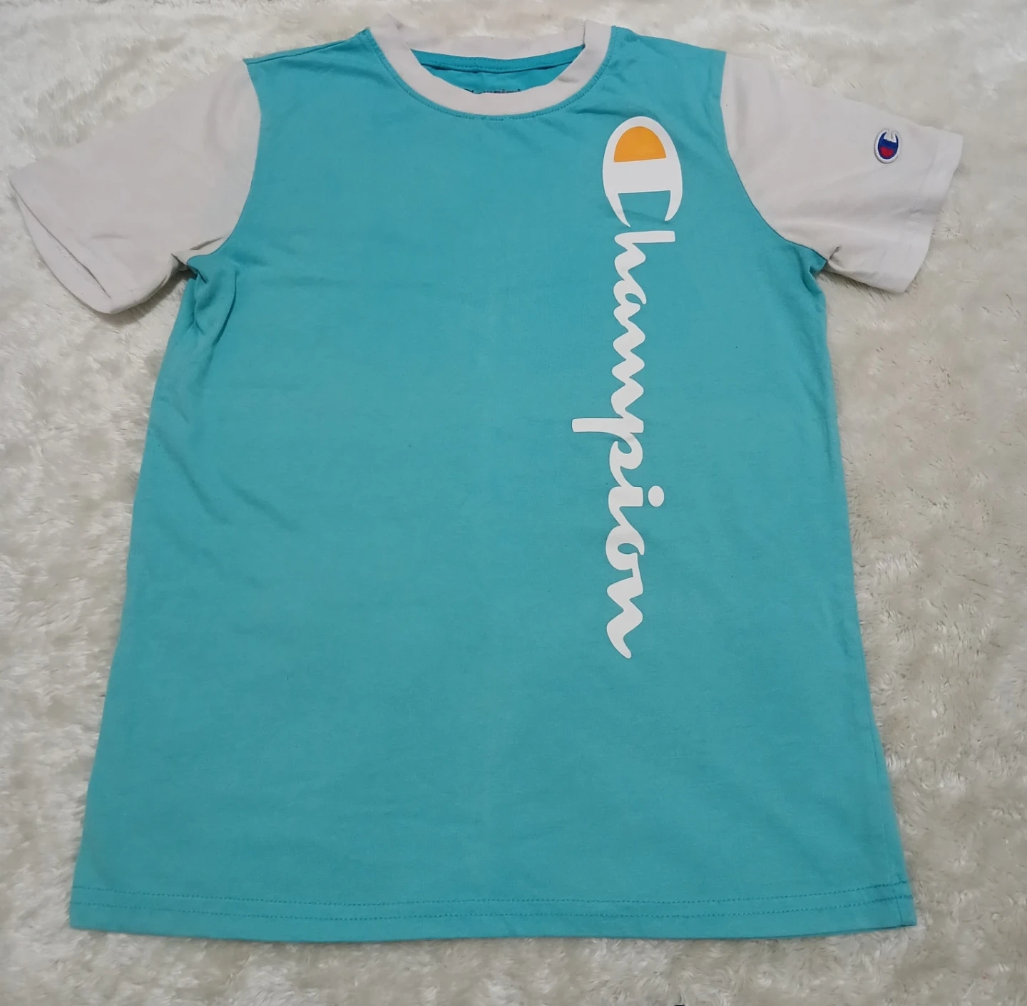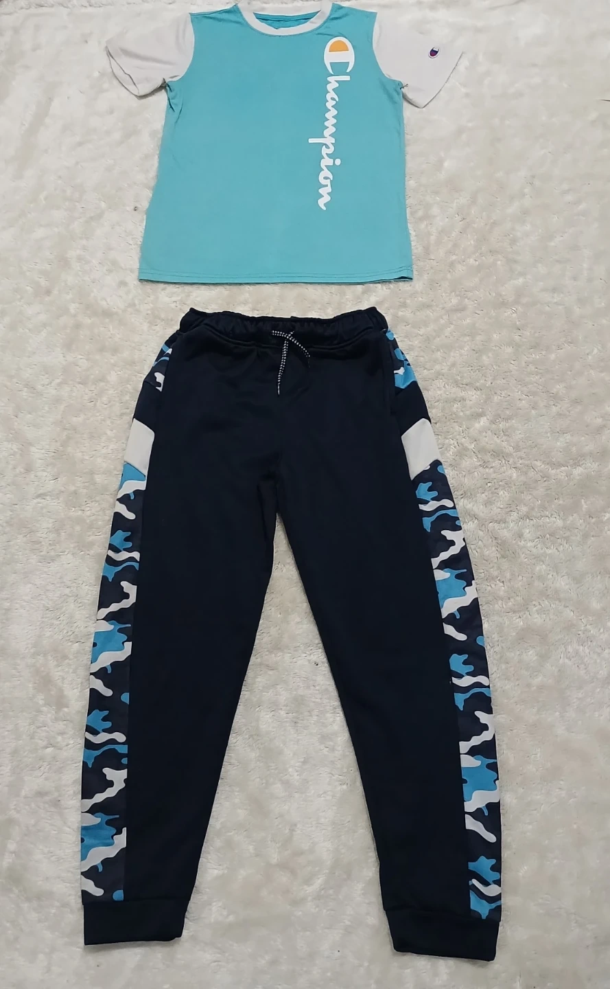 The Champion t-shirt is a teal and white colour. The track pants are navy blue with camouflage accents, Perfect for everyday wear