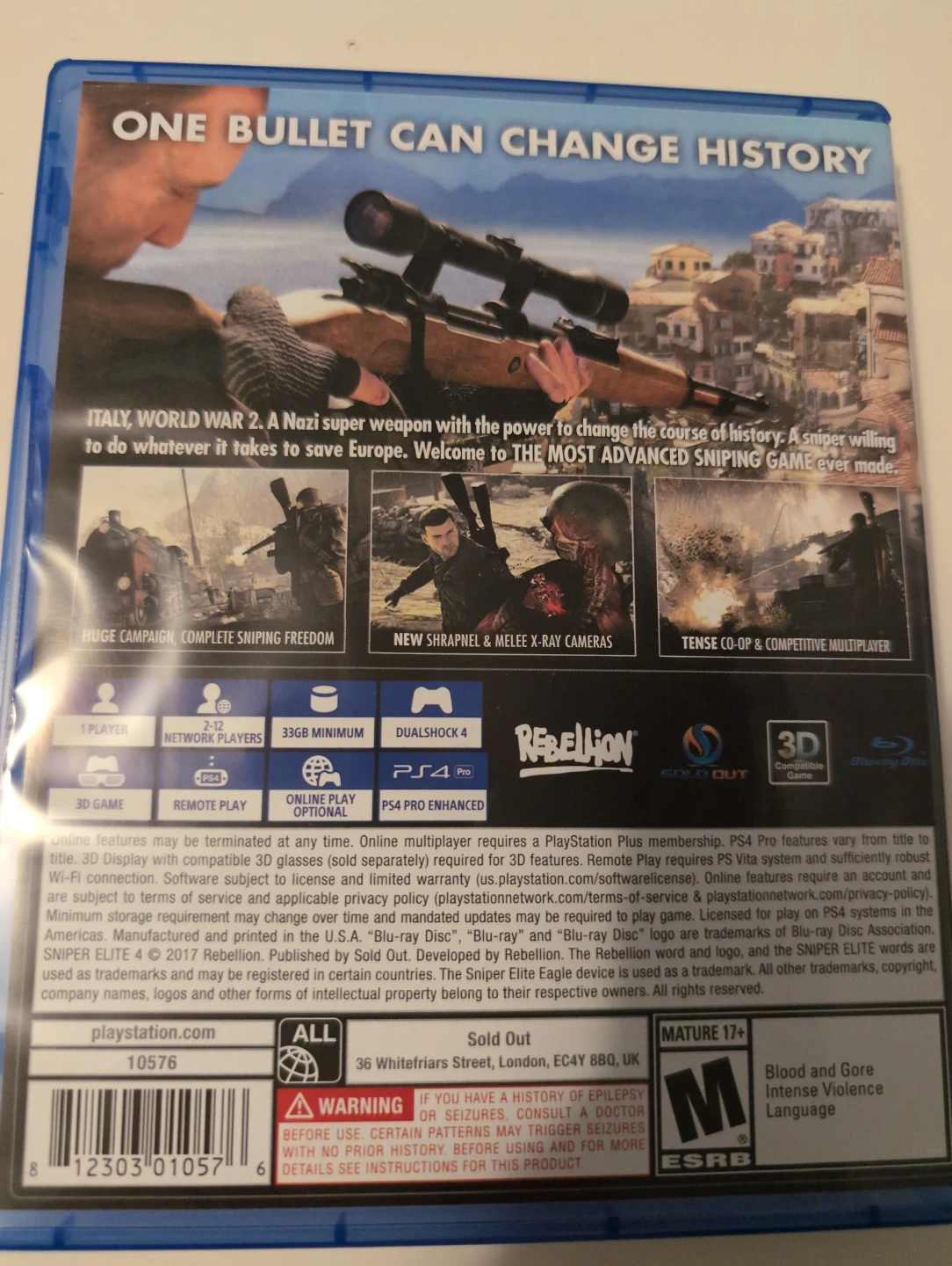Buy & SellSniper Elite 4 PS4Sniper Elite 4 PS4$10This is the Sniper Elite 4 game for PlayStation 4. It features intense sniper gameplay and a World War II setting. The game is rated M for Mature.ConditionNewWHERE TO MEETAgincourt libraryView MapSELLERverifiedoliverTam O'Shanter1004 reviews1 chats·0 favorites·8 viewsSEND CHAT TO SELLERHi oliver! I’m interested in your listing.Hi oliver! I’m interested in your listing.Get the Karrot app to chatSign In to chat