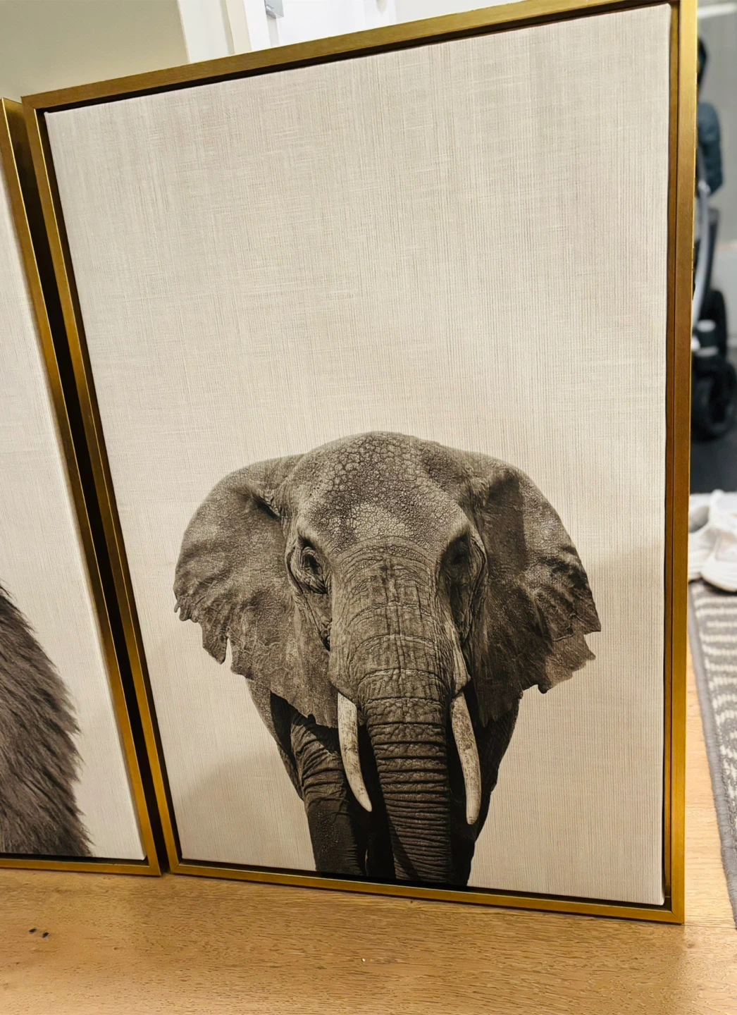 This striking canvas wall art features animal black and white photographs. It's framed with a sleek gold metal border, adding a touch of modern elegance to any room. The textured canvas gives the artwork a rich feel.