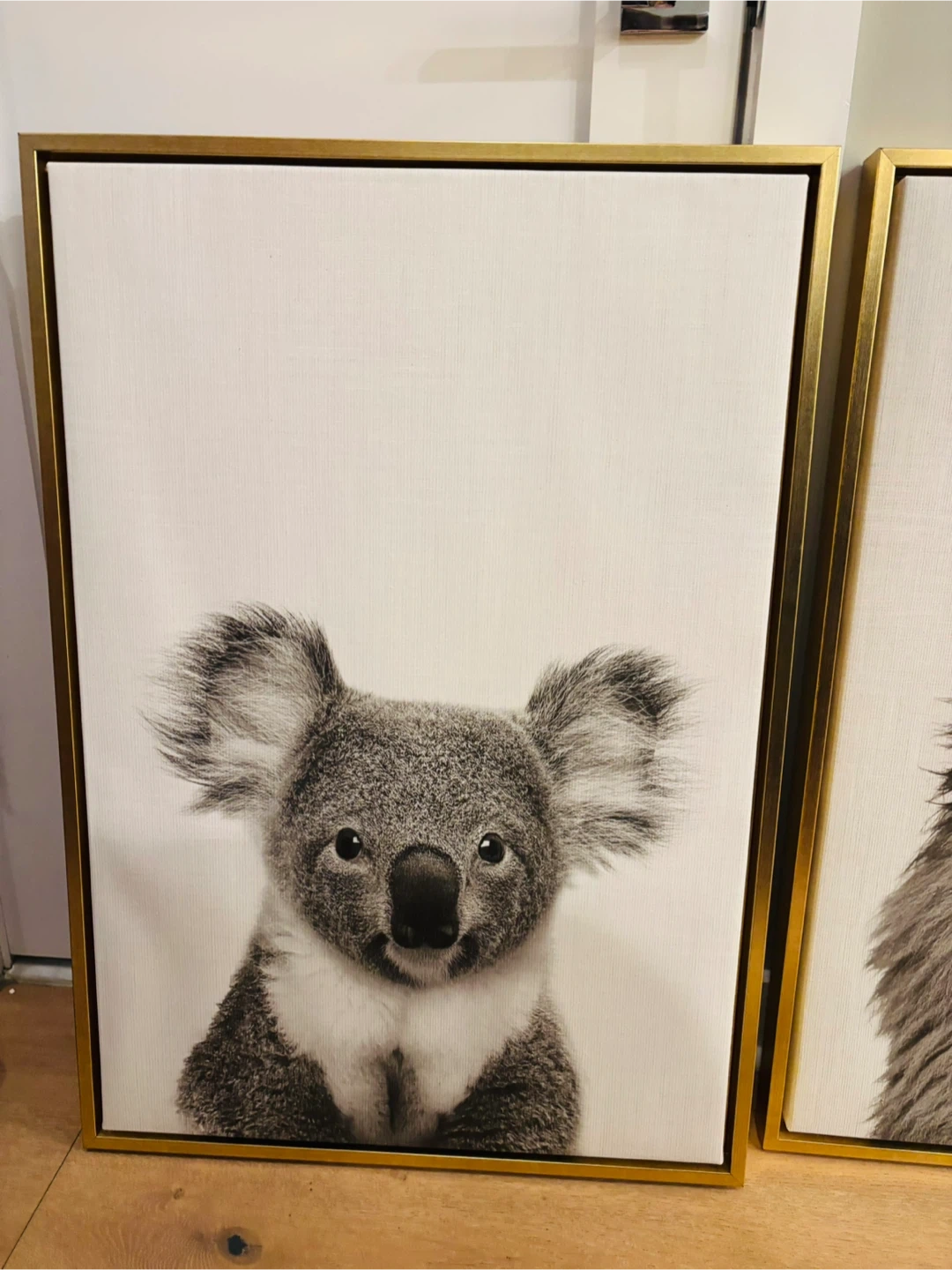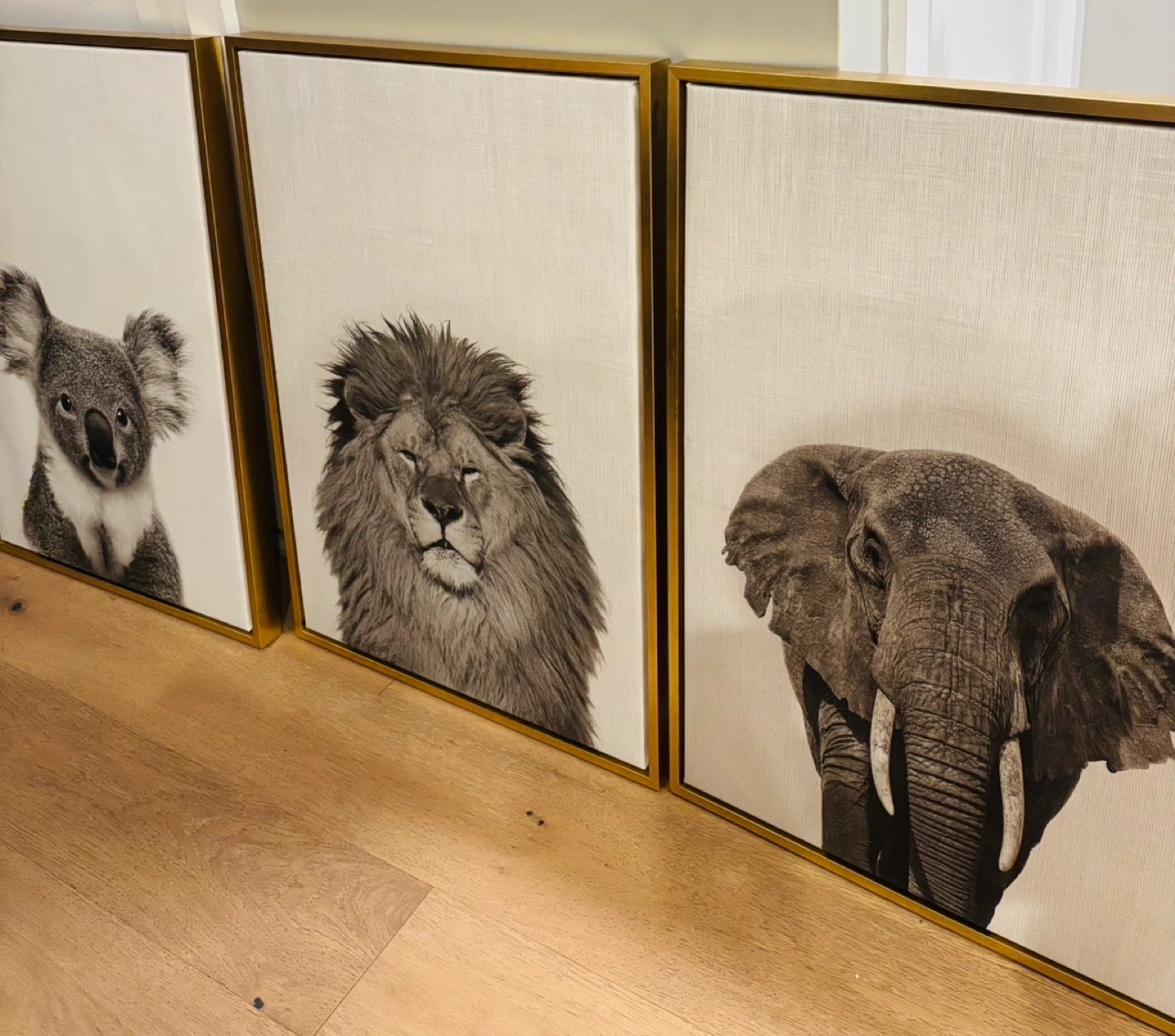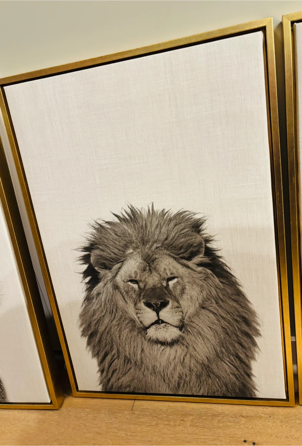 This striking canvas wall art features animal black and white photographs. It's framed with a sleek gold metal border, adding a touch of modern elegance to any room. The textured canvas gives the artwork a rich feel.