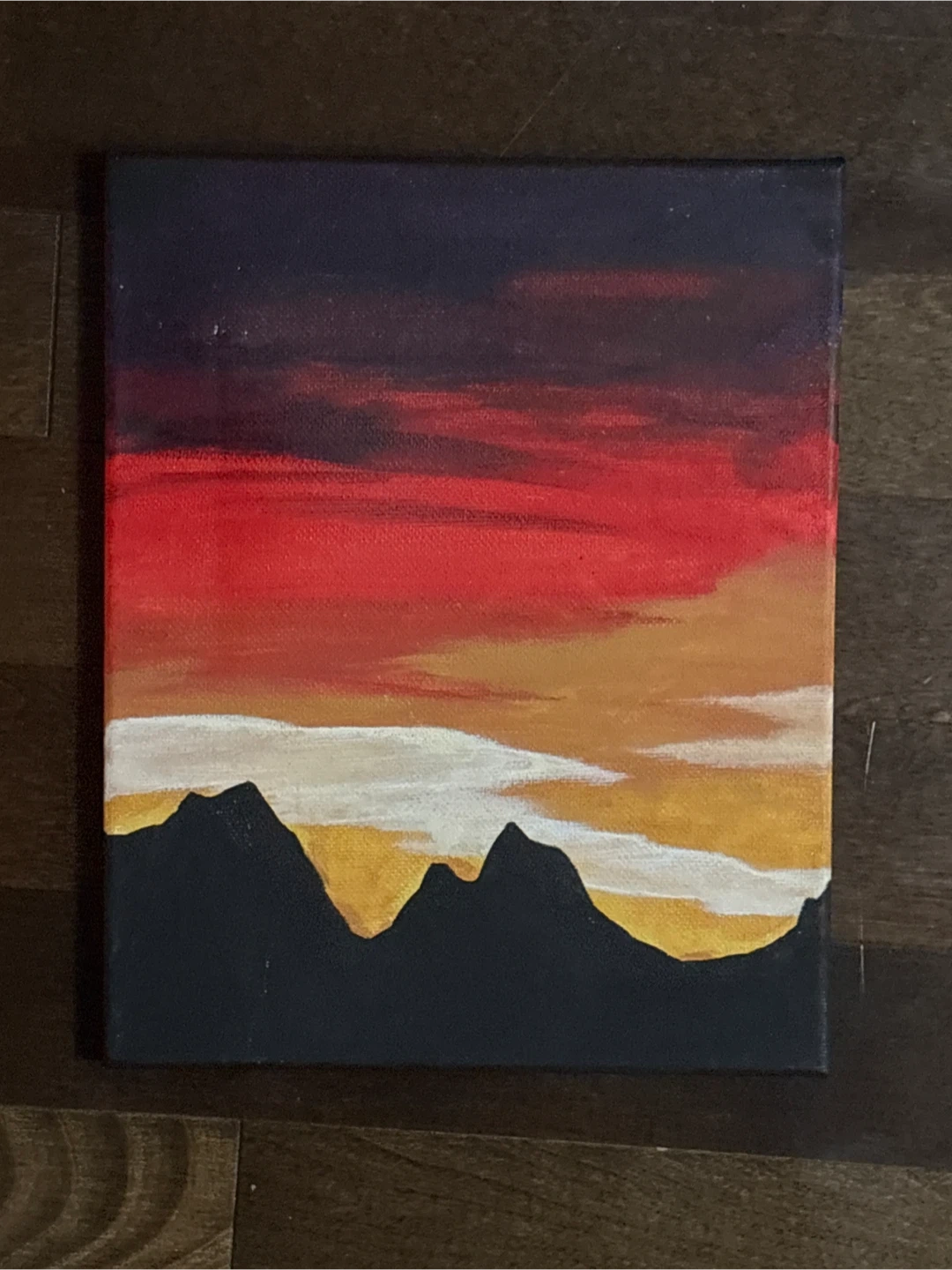 Acrylic painting on canvas depicting a sunset over mountains. The colours are rich with deep blues, vibrant reds, and warm oranges. It's a lovely piece to add to your decor!