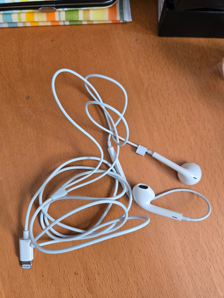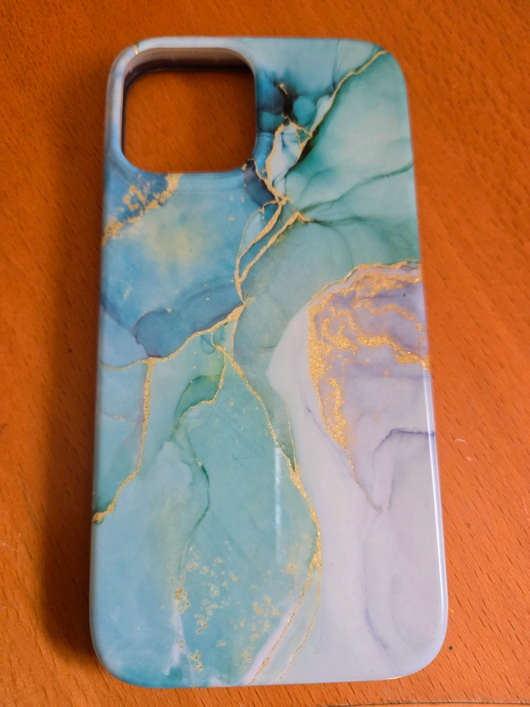 Selling a used iPhone 12 Pro case with a unique marble design in shades of blue and gold. Also including a pair of Apple EarPods and a lightning charger cable. All items are in good condition and ready for a new home!