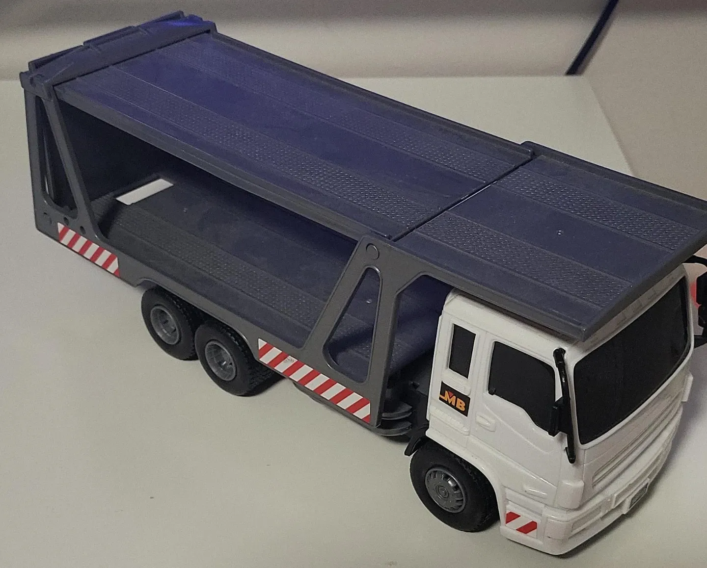 This is a toy car carrier truck with a white cab and grey trailer. It has reflective red and white striped accents on the trailer. The trailer features a blue, foldable deck.
