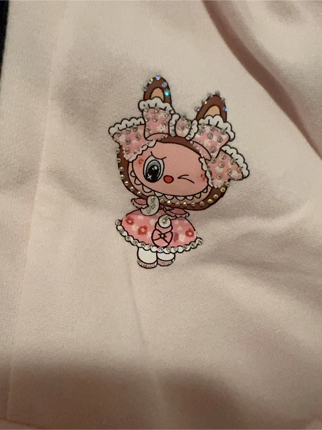 This cute pink layered crewneck sweatshirt features Labubu with rhinestones. It has black trim along the sides and sleeves, and a black tank top underneath.