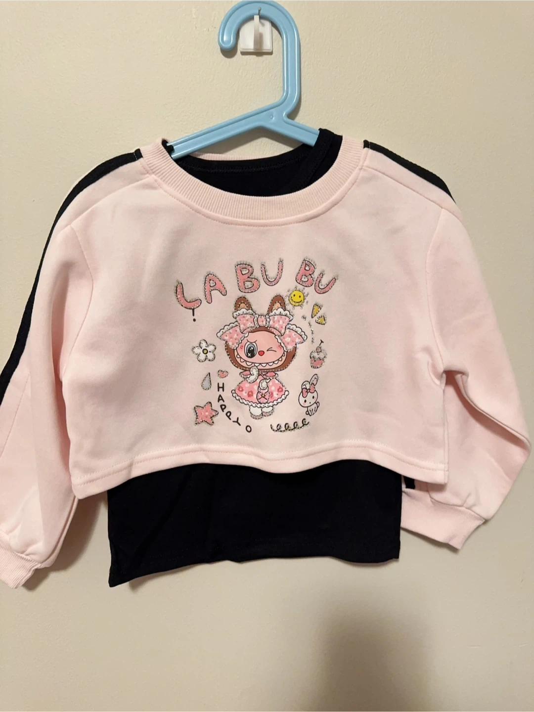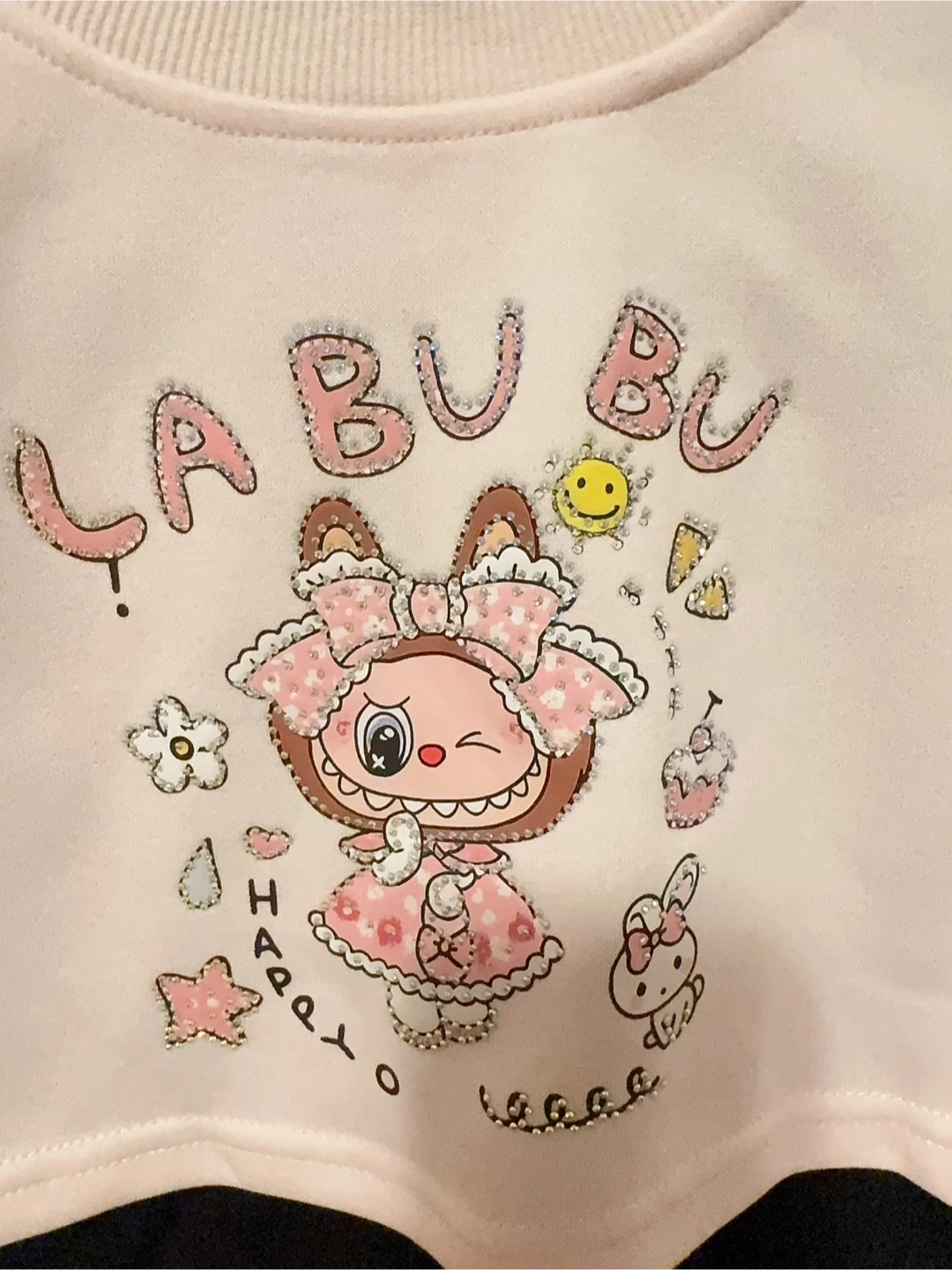 This cute pink layered crewneck sweatshirt features Labubu with rhinestones. It has black trim along the sides and sleeves, and a black tank top underneath.