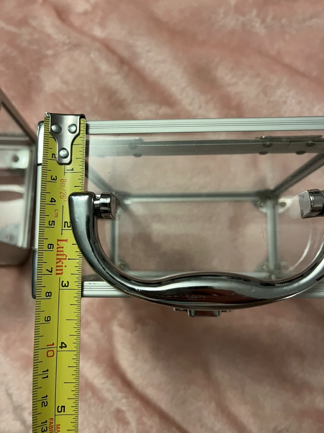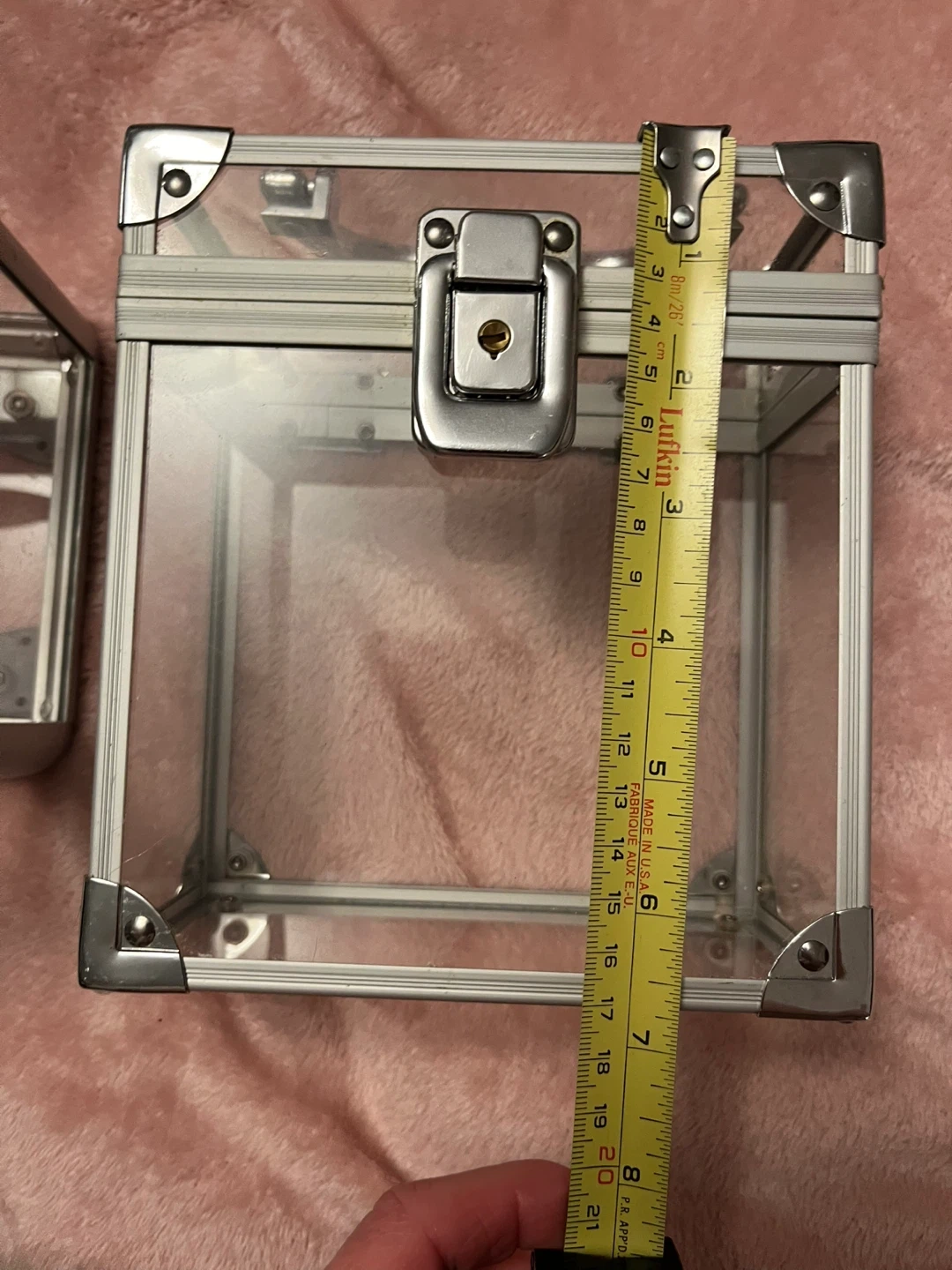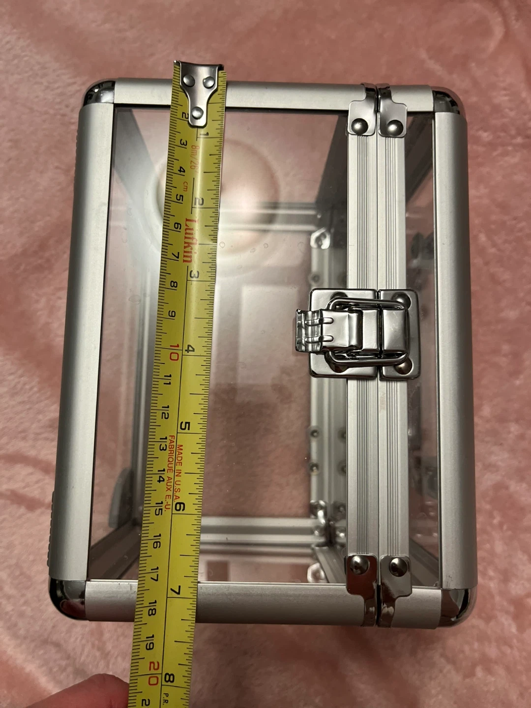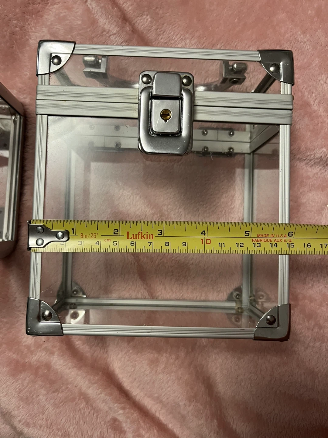 This clear case with silver metal trim and a latch closure. It's made of transparent acrylic and metal. Dimensions are roughly 6 inches high and 6 inches wide. It's handy for storing makeup or small accessories!