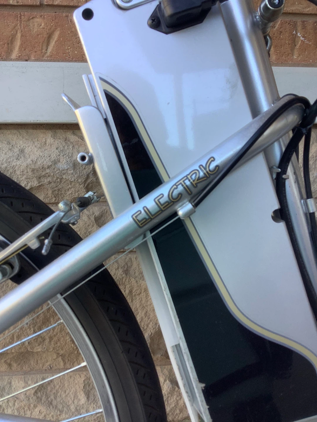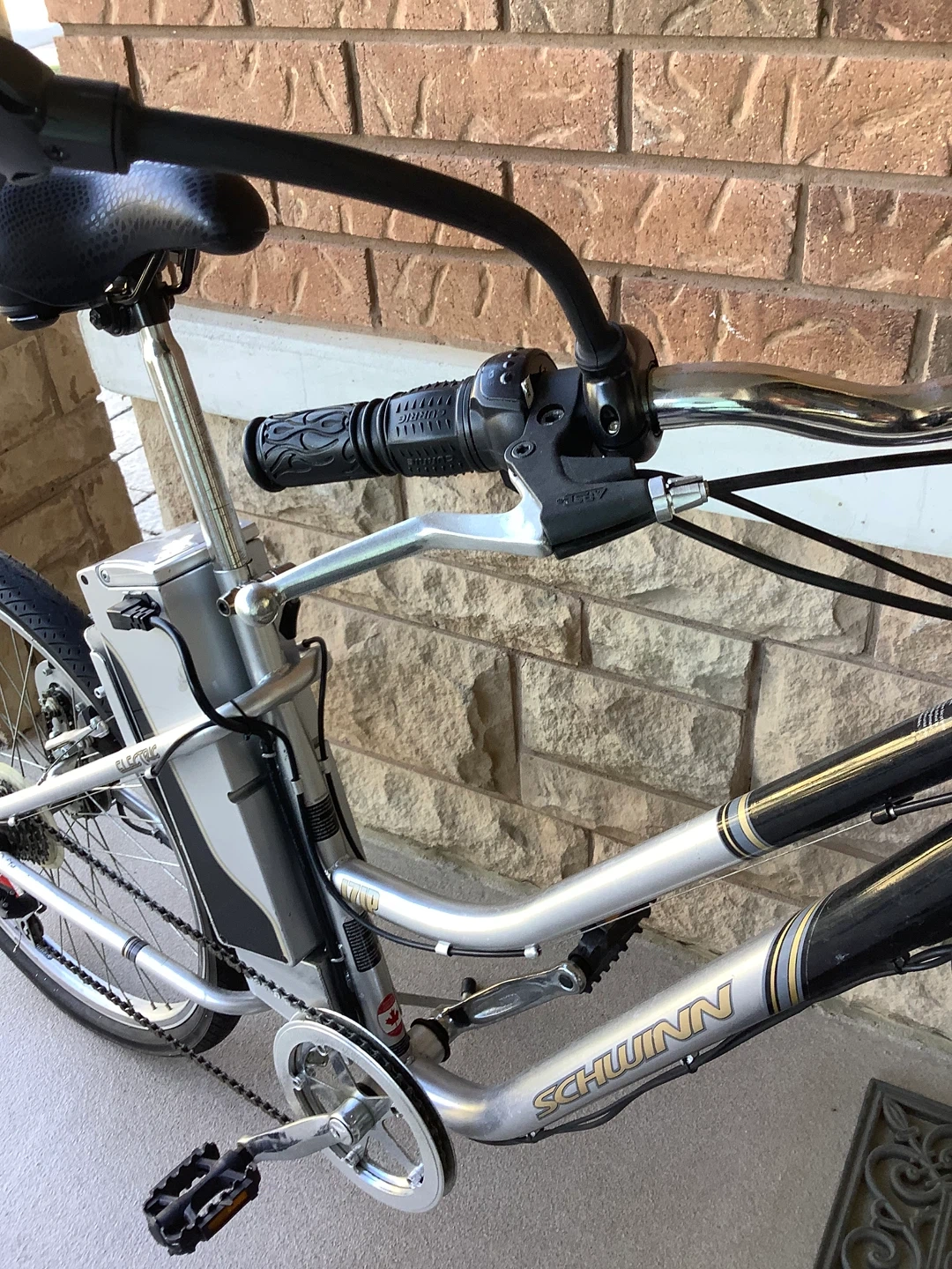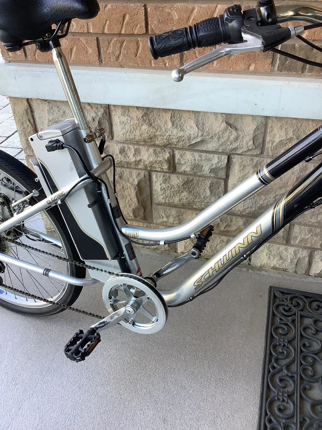 This is a Schwinn electric bicycle. It's silver and black with a comfortable seat. The pedals have a good grip.