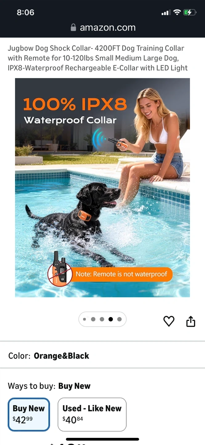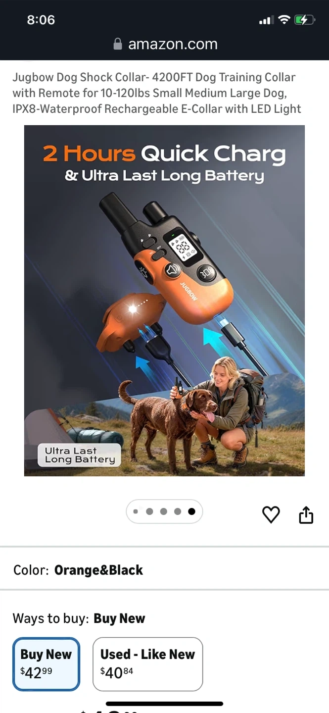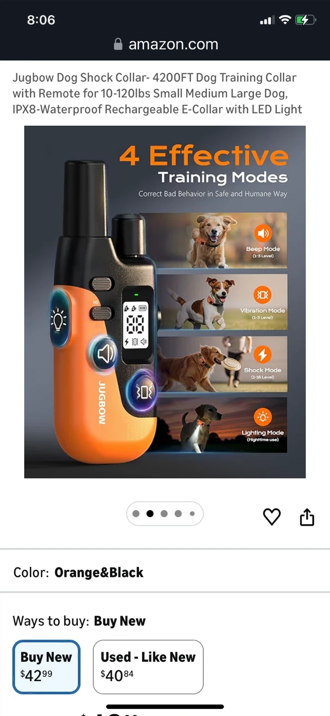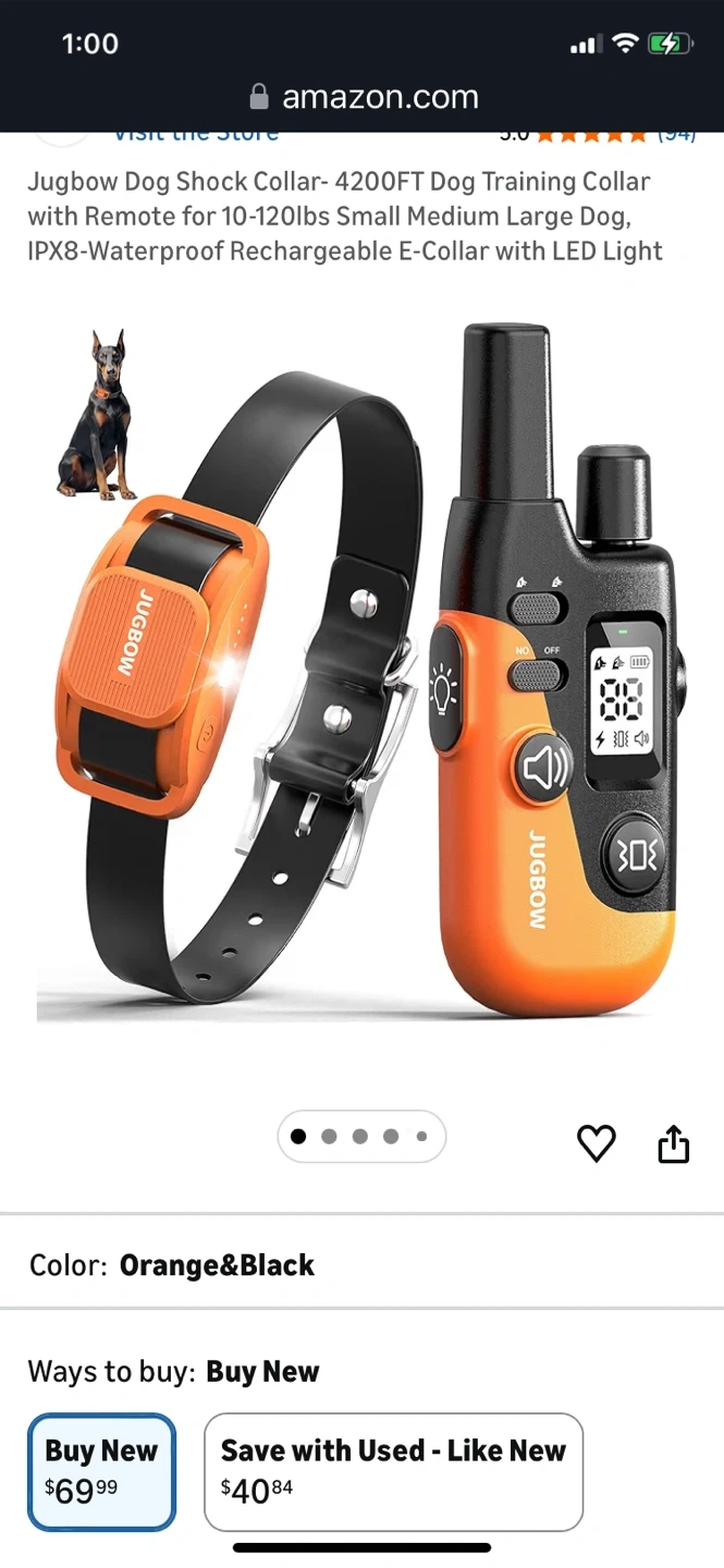 This is a Jugbow dog training collar with remote. It's IPX8-waterproof and rechargeable. Features include 4 effective training modes and a safety LED light. The adjustable collar fits dogs from 10-120 lbs.