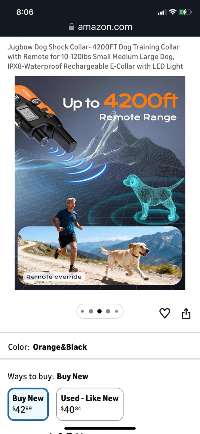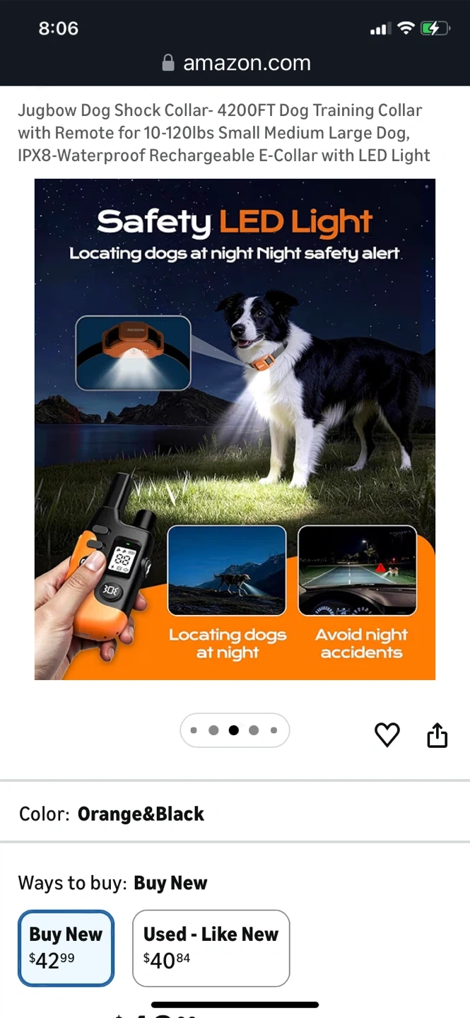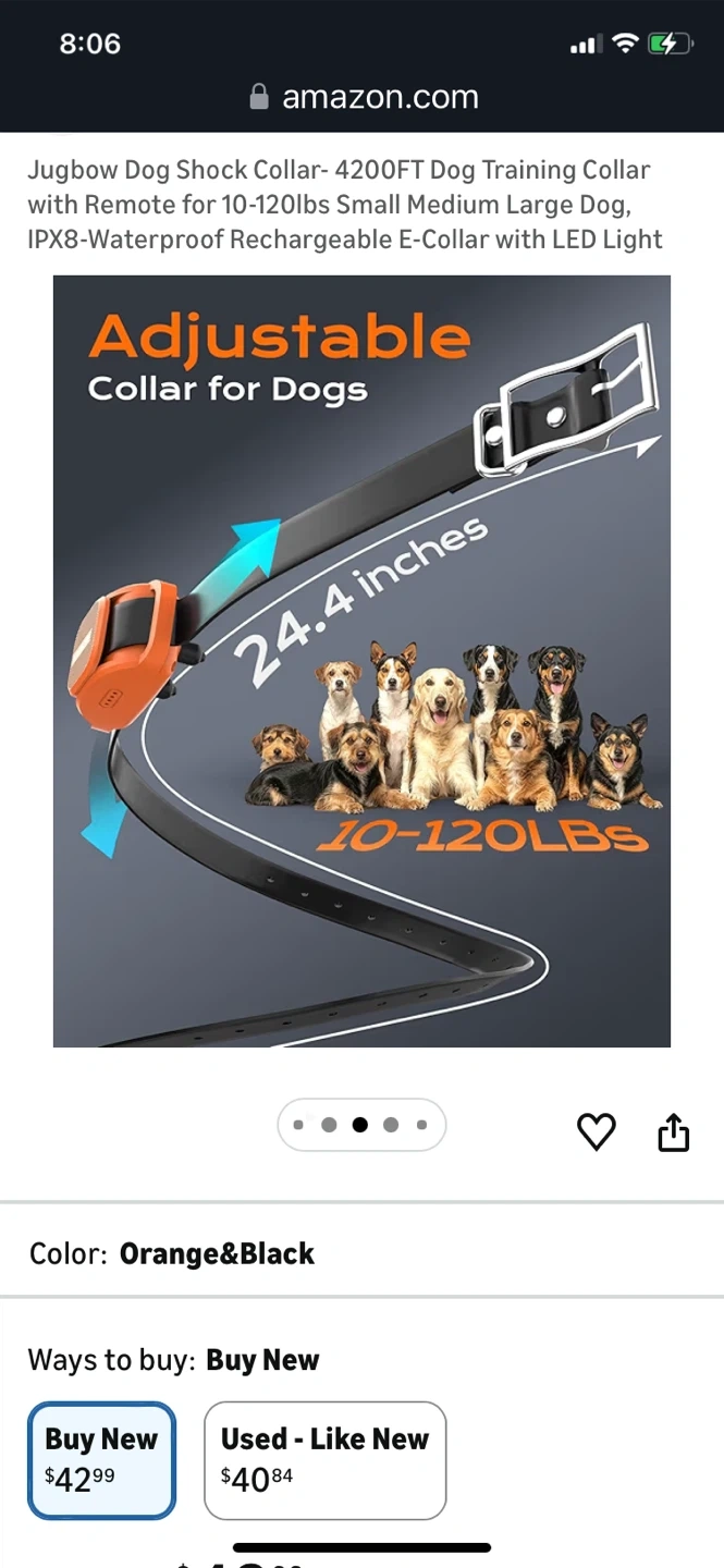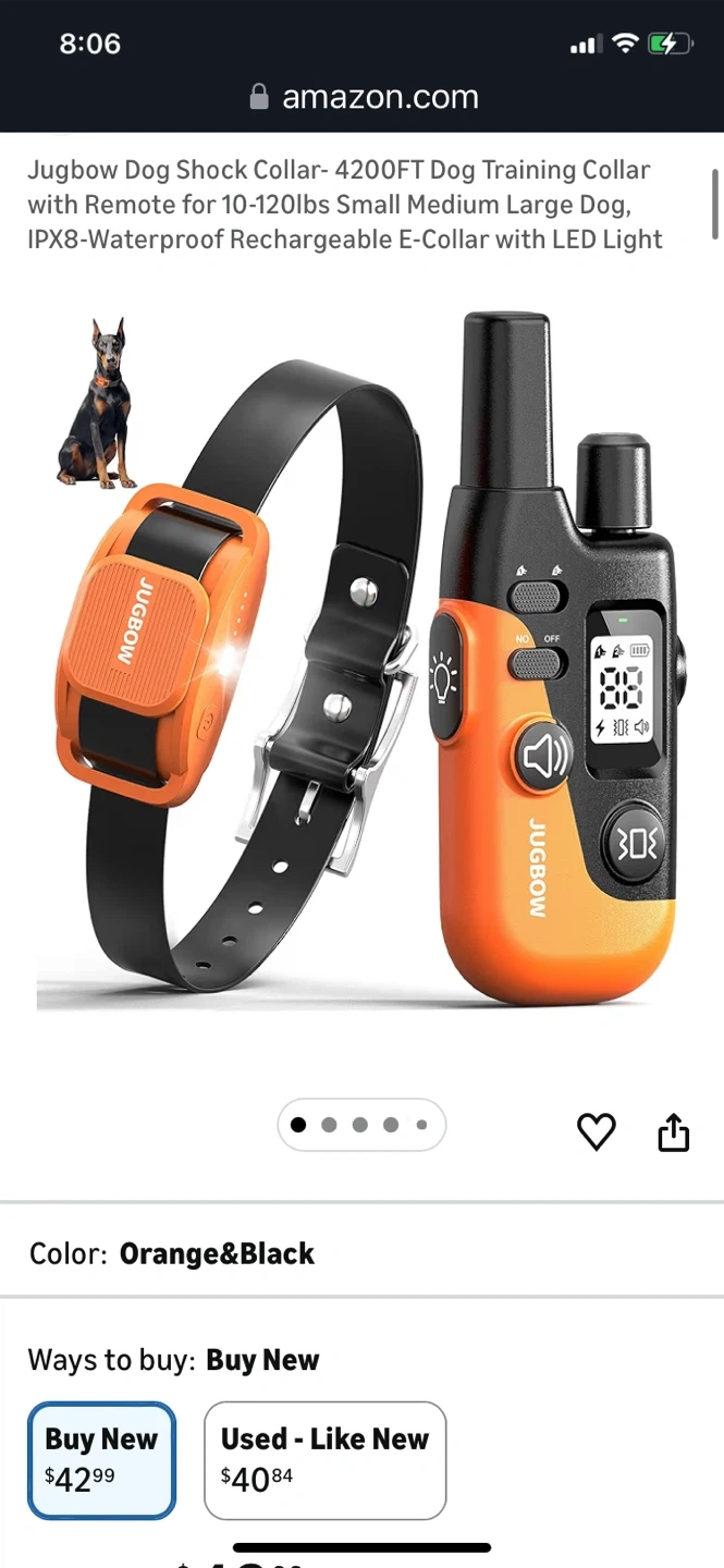 This is a Jugbow dog training collar with remote. It's IPX8-waterproof and rechargeable. Features include 4 effective training modes and a safety LED light. The adjustable collar fits dogs from 10-120 lbs.