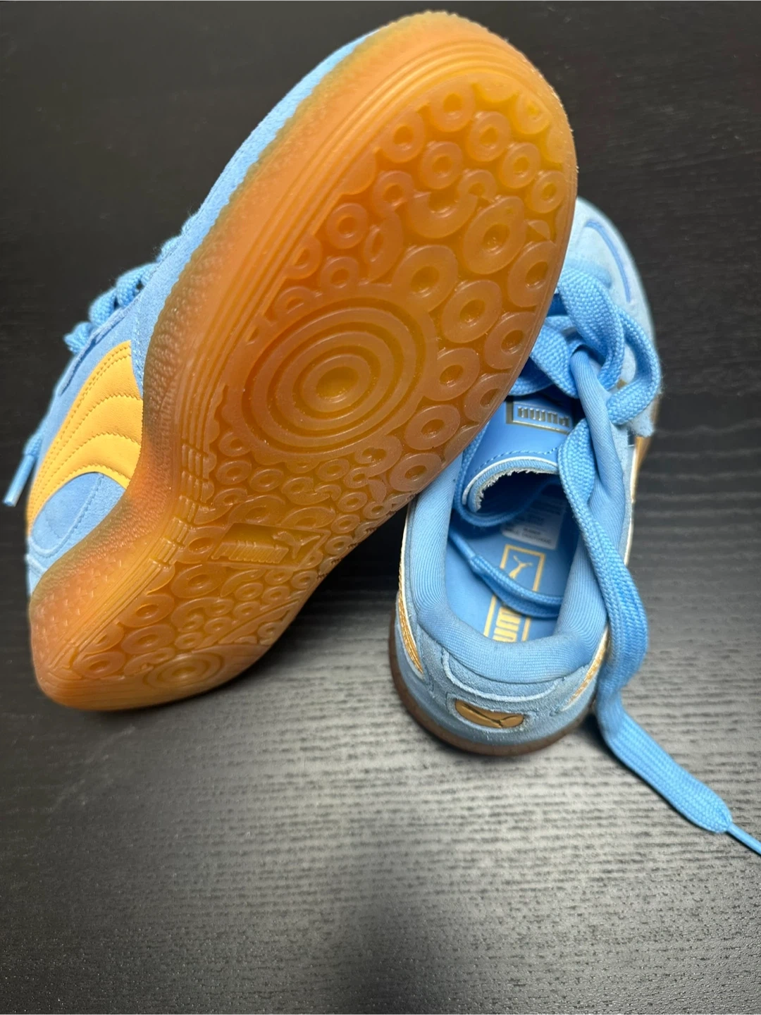 Kids' Puma Palermo sneakers in a light blue and gold colourway. These shoes feature a suede upper with classic Puma branding. Durable gum sole for traction. Great for everyday wear!