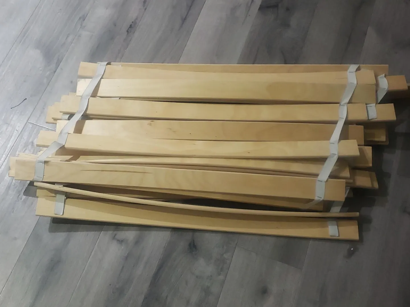 Wooden bed slats for mattress support. These are made of natural wood and are bound together with straps for easy storage. They're ready to be installed for a bed frame.