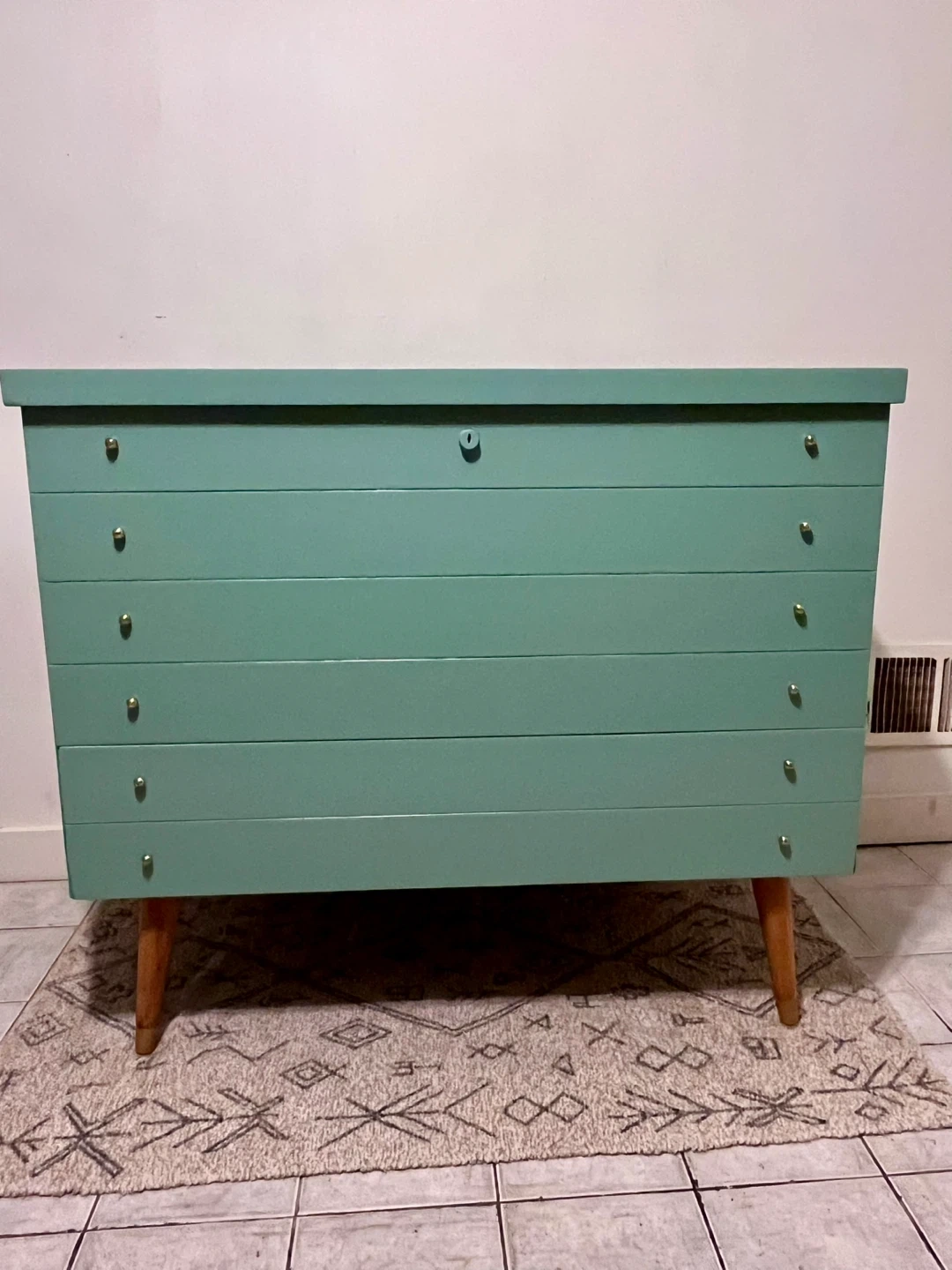 This Honderich retro mcm cedar line beauty has been completely restored using a high quality melamine based furniture paint in sea foam turquoise bit more greener in person. ( sample upon purchase) the top lifts up with ample gorgeous cedar lined space with a hidden cedar lined single drawer at the bottom. She’s lovely.