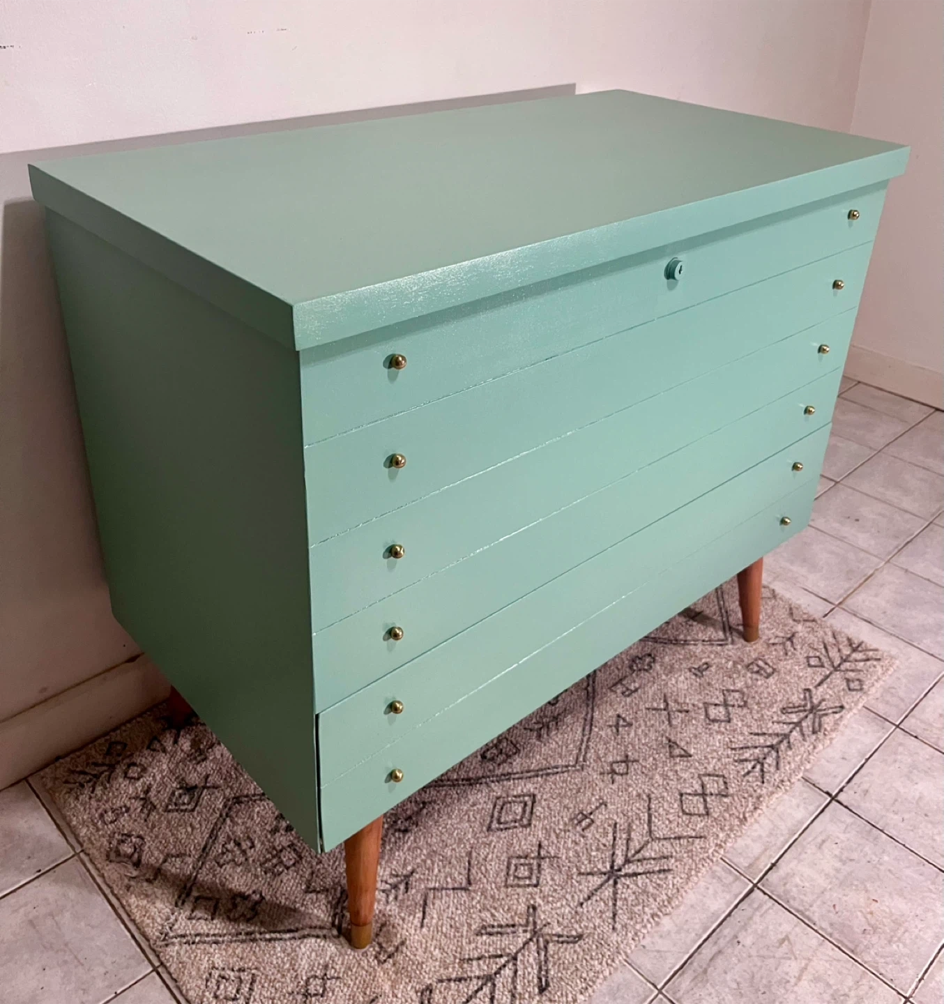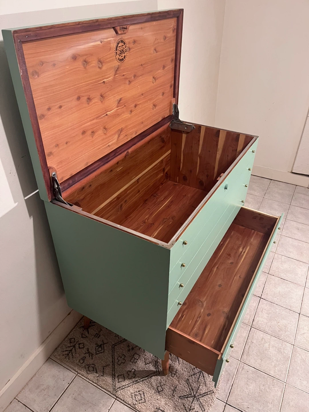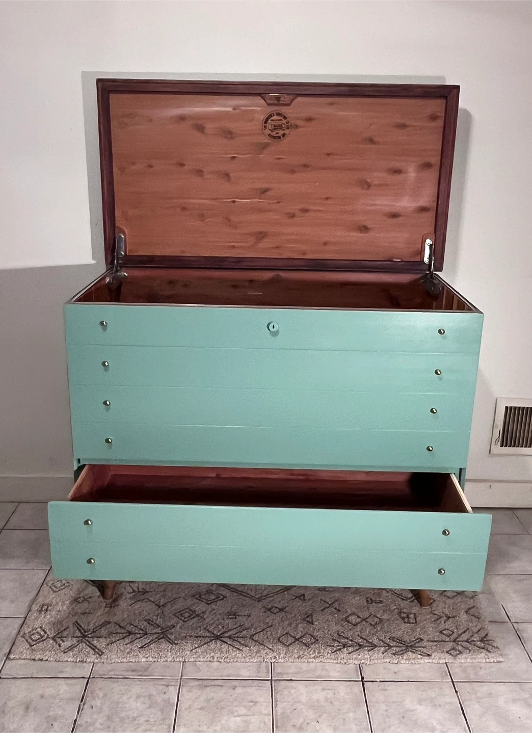 This Honderich retro mcm cedar line beauty has been completely restored using a high quality melamine based furniture paint in sea foam turquoise bit more greener in person. ( sample upon purchase) the top lifts up with ample gorgeous cedar lined space with a hidden cedar lined single drawer at the bottom. She’s lovely.
