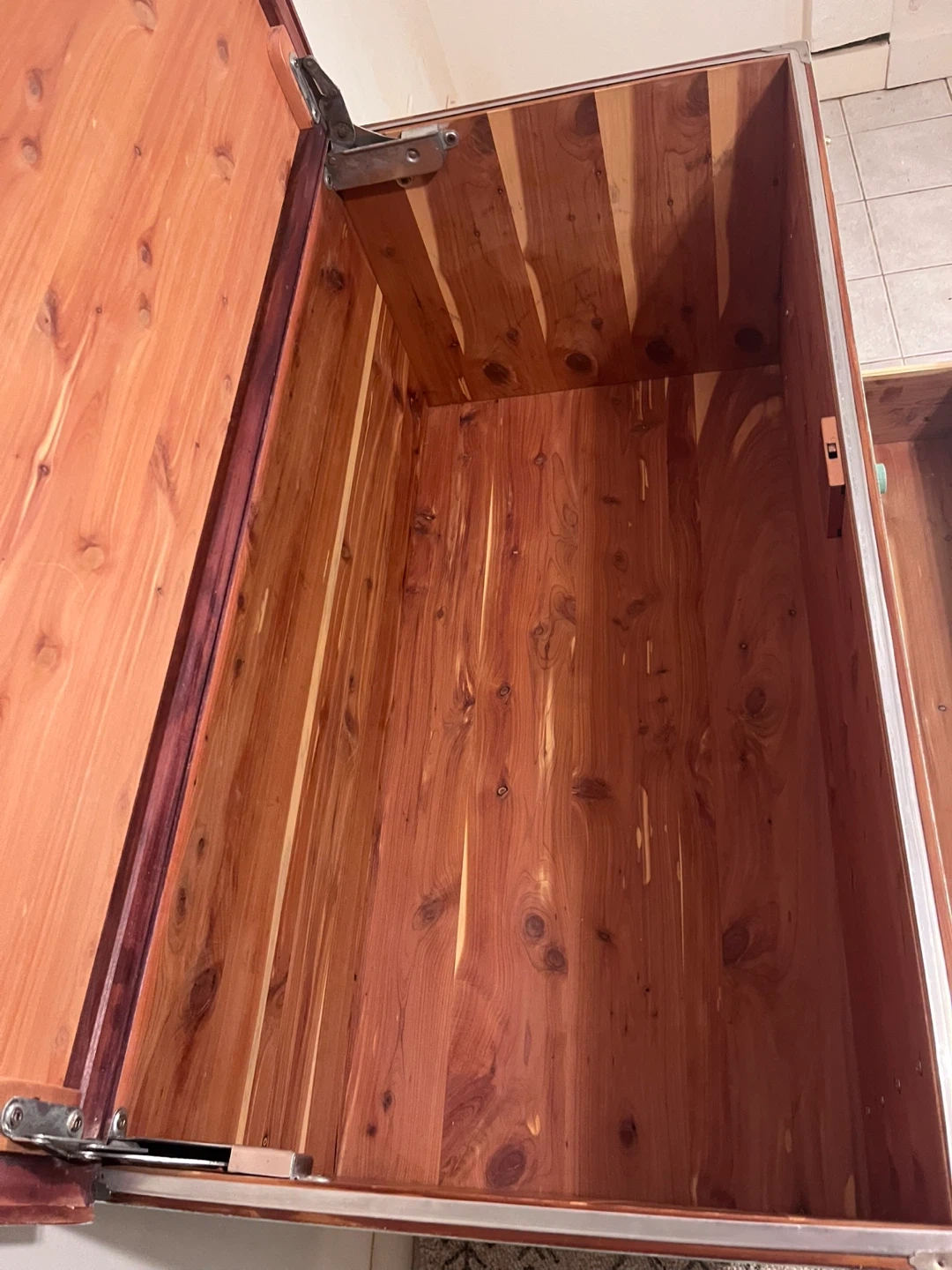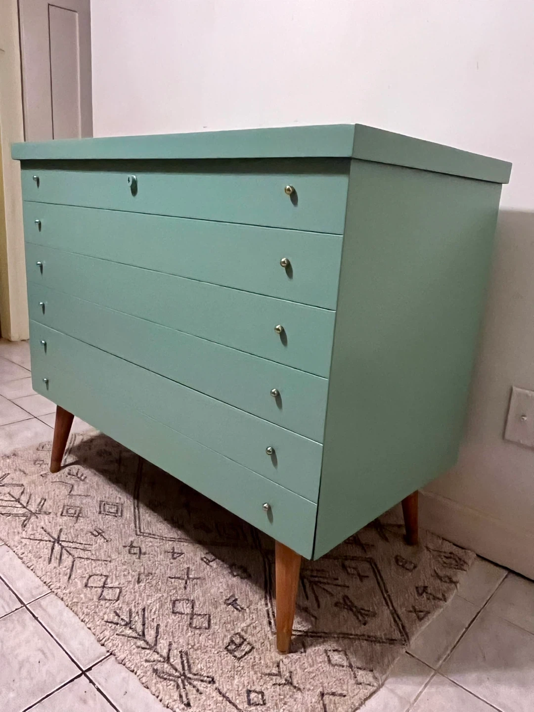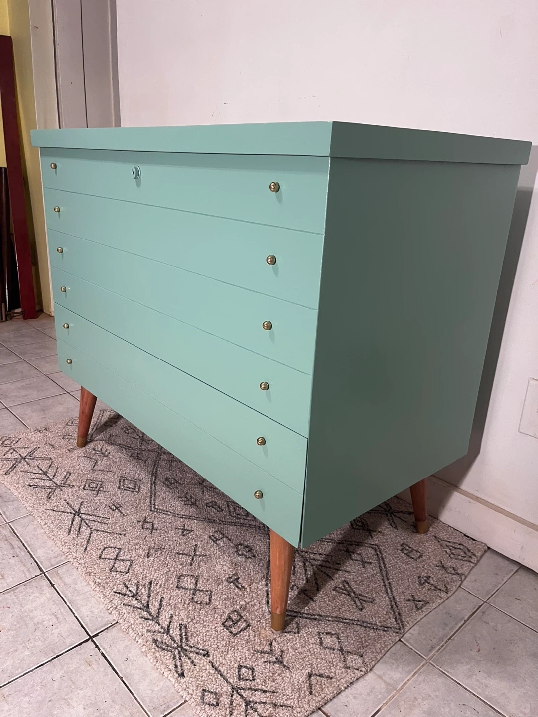 This Honderich retro mcm cedar line beauty has been completely restored using a high quality melamine based furniture paint in sea foam turquoise bit more greener in person. ( sample upon purchase) the top lifts up with ample gorgeous cedar lined space with a hidden cedar lined single drawer at the bottom. She’s lovely.
