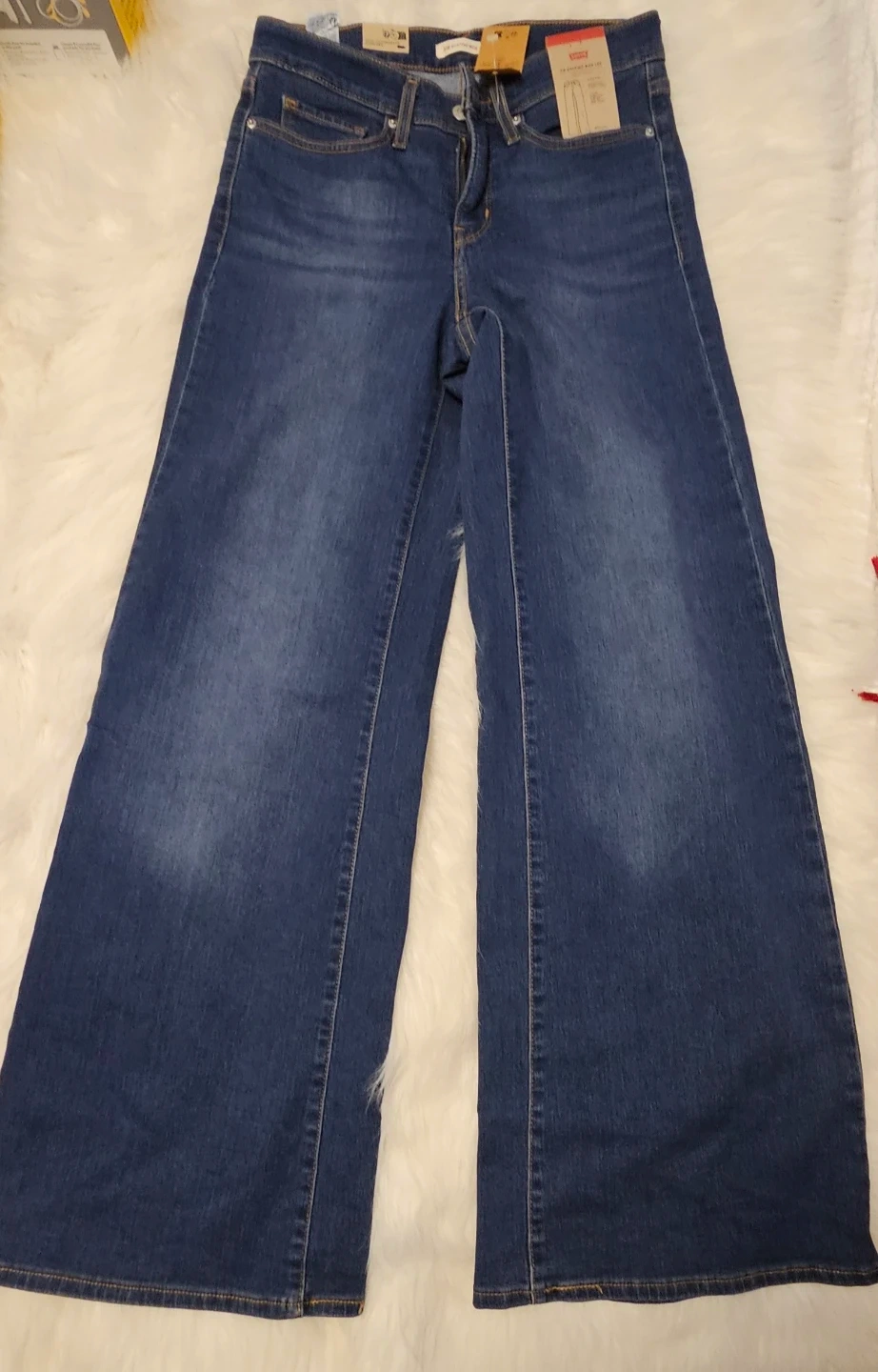 These are Levi's women's jeans with a high-waisted, wide-leg fit. They're made of denim. The size is 28x32. These jeans would be useful for a casual outing or to dress up for a night out. A Mid Rise, Smoothing Tummy Panel, Loose Through the Hip and Thigh, Wide Leg. Brand New!
