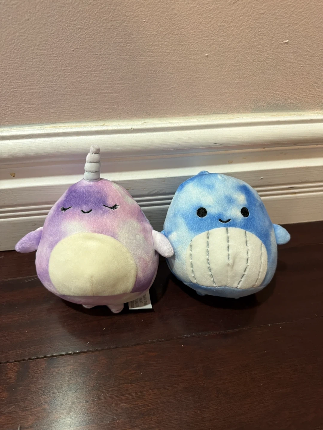 This is a set of two Squishmallows plush toys, one whale and one narwhal. They're super soft and cuddly! Great for kids who love ocean animals. The whale is blue with white cloud-like patterns. The narwhal is purple and pink with a white horn.