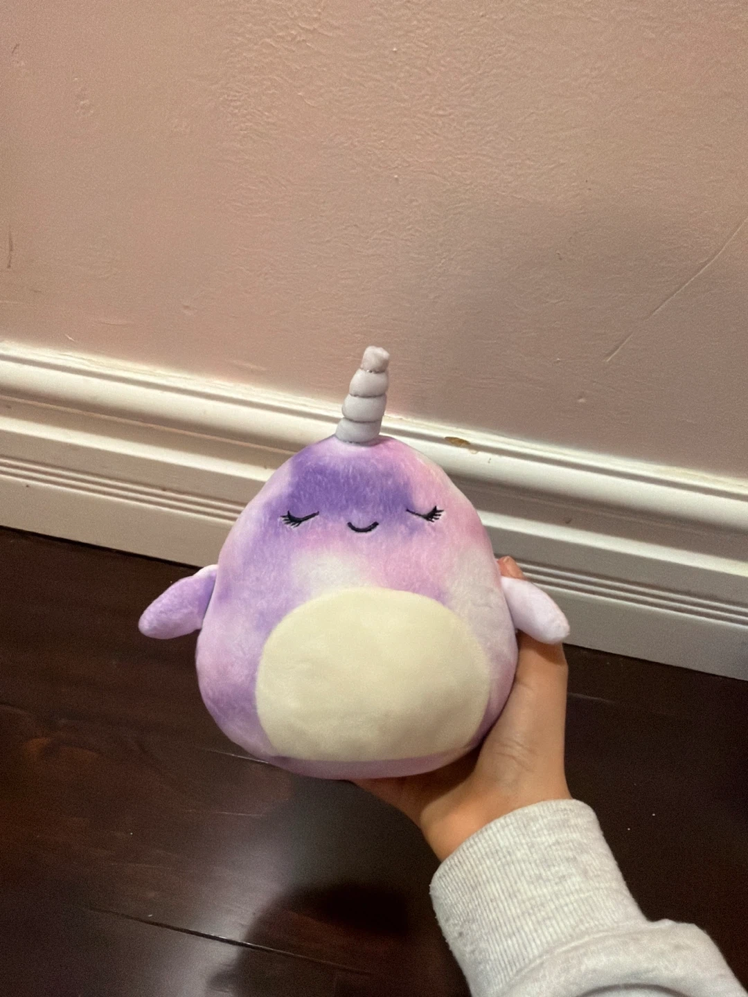This is a set of two Squishmallows plush toys, one whale and one narwhal. They're super soft and cuddly! Great for kids who love ocean animals. The whale is blue with white cloud-like patterns. The narwhal is purple and pink with a white horn.