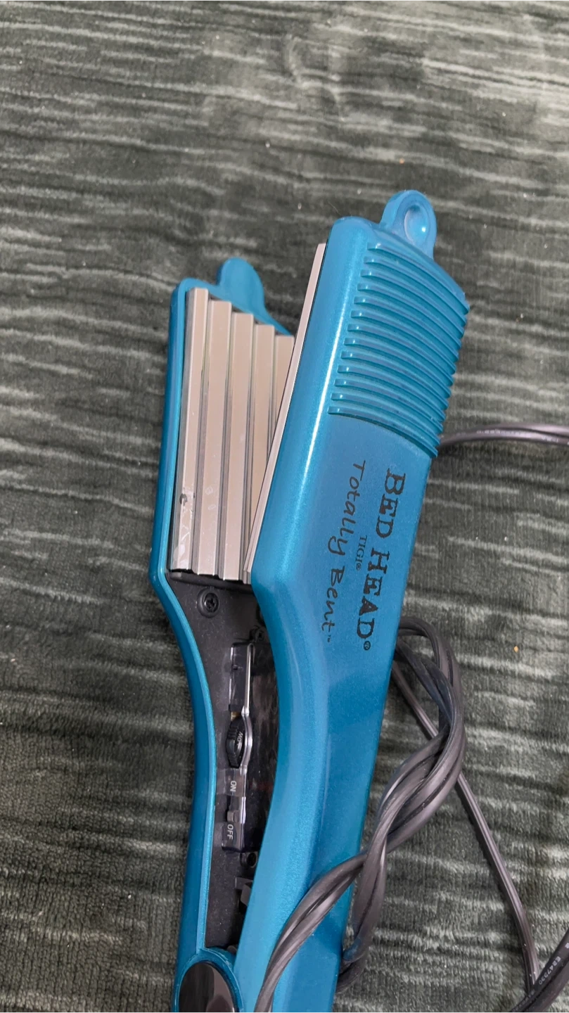 This is a Bed Head Totally Bent hair crimper. It's a teal blue colour. Ceramic plates for smooth styling. On/off switch is clearly marked.
