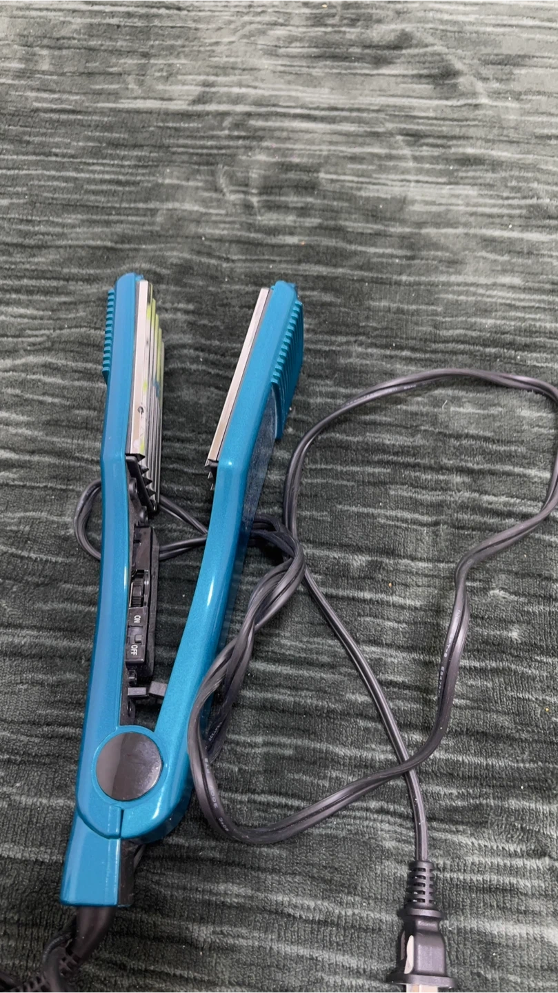This is a Bed Head Totally Bent hair crimper. It's a teal blue colour. Ceramic plates for smooth styling. On/off switch is clearly marked.