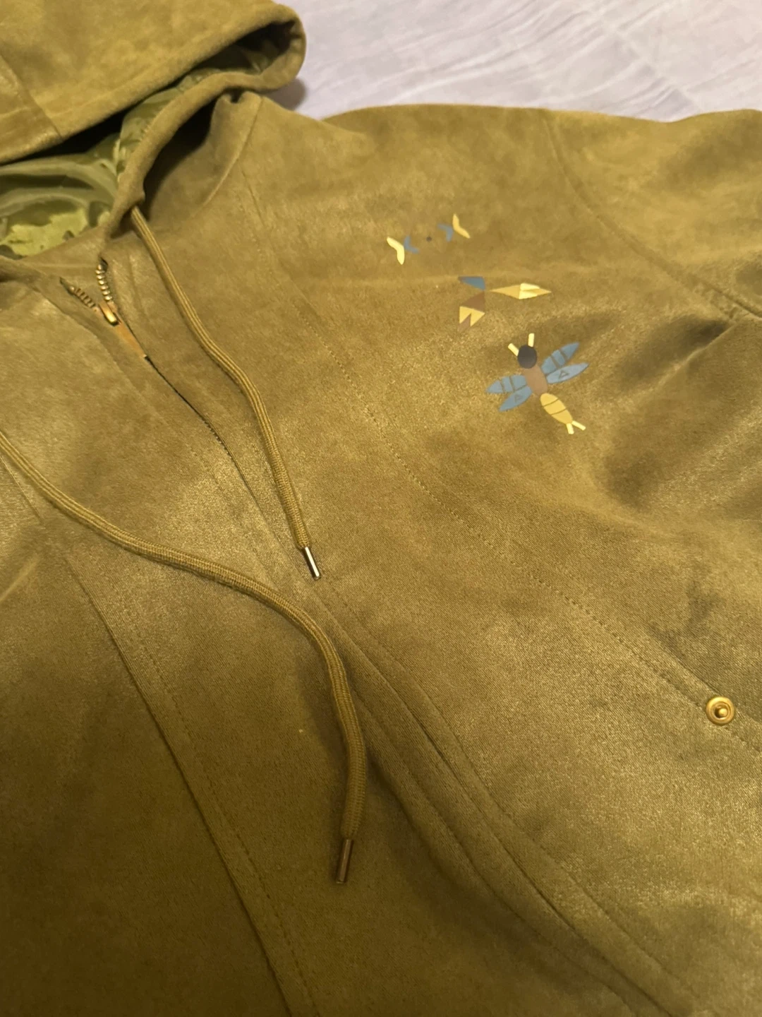Olive green hooded jacket with a soft, suede-like texture. Features unique embroidered designs on the front. Fits sizes M-L. A stylish layer for casual wear!