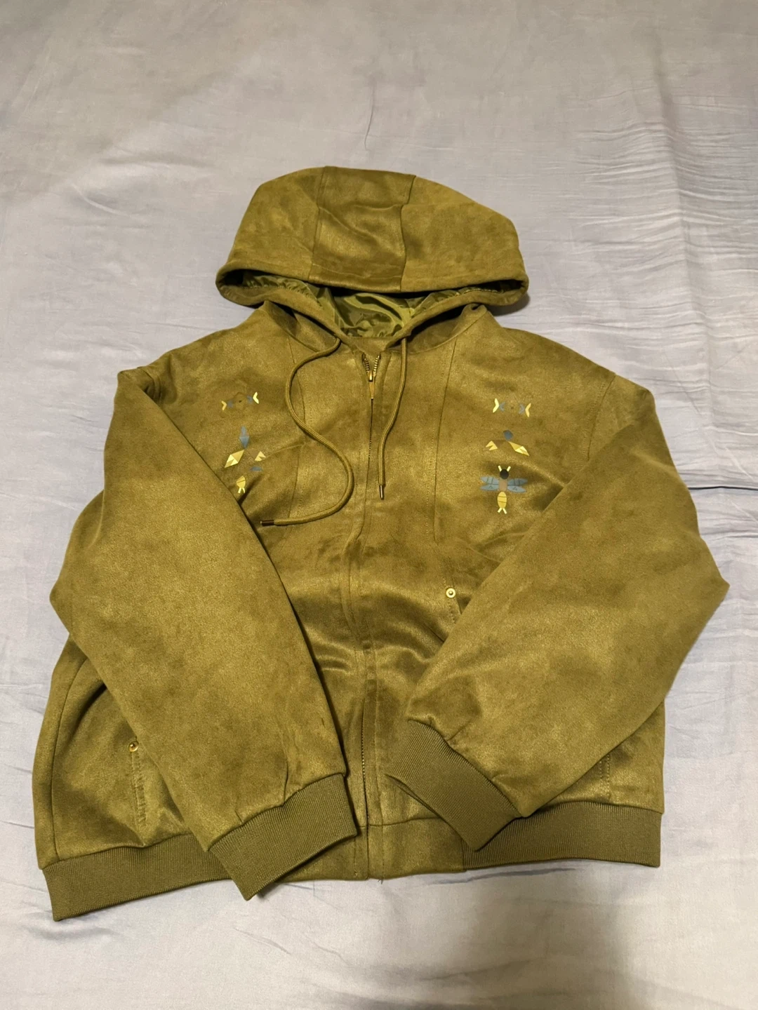 Olive green hooded jacket with a soft, suede-like texture. Features unique embroidered designs on the front. Fits sizes M-L. A stylish layer for casual wear!