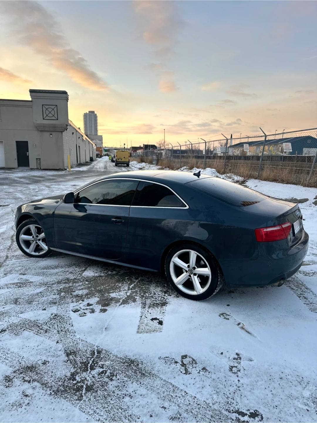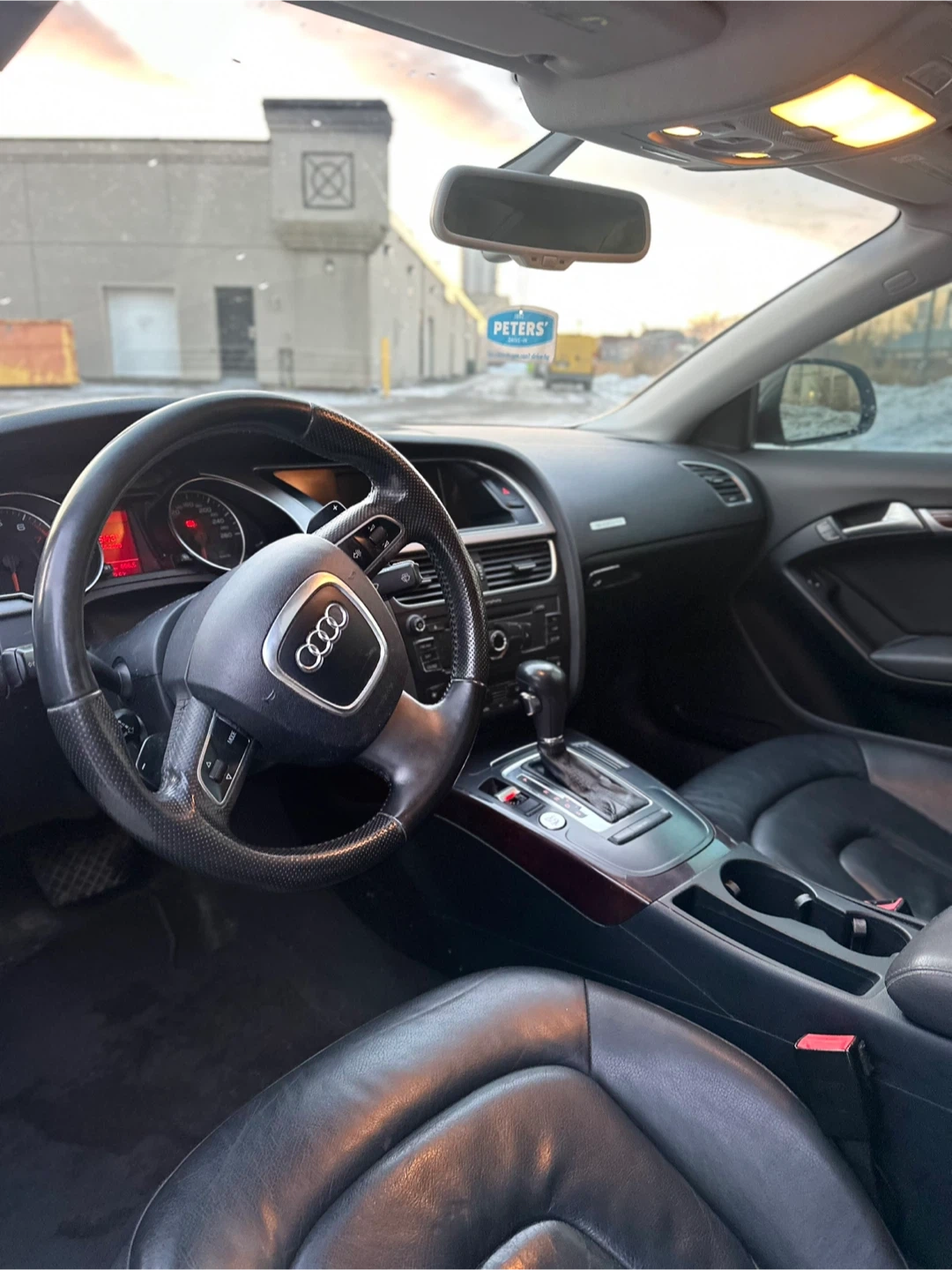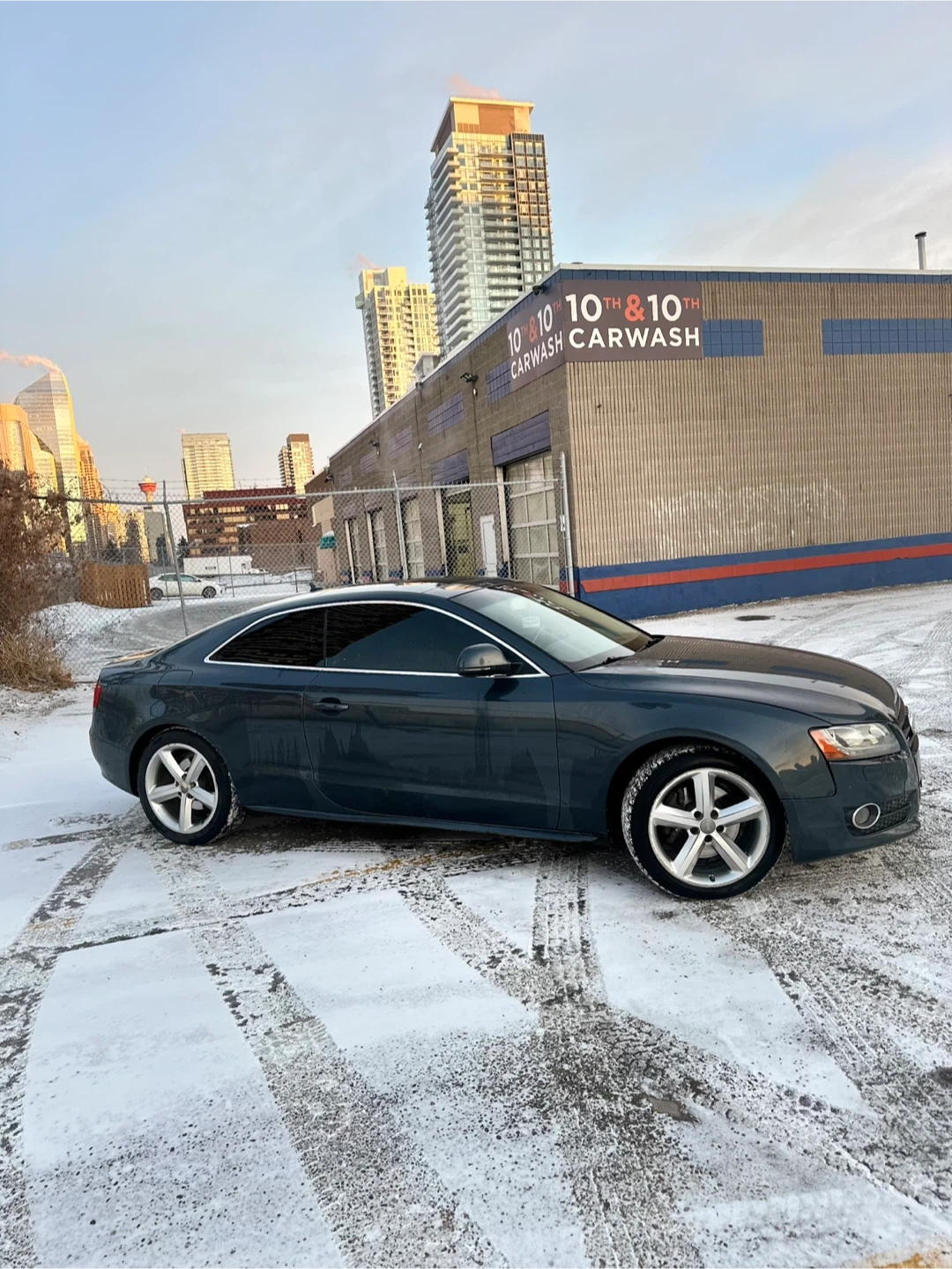 This is a dark grey Audi A5 coupe. It has black leather interior and alloy wheels. This car is great for city driving and highway cruising.