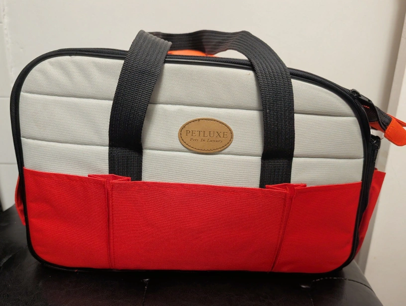 This is a PetLuxe pet carrier bag. It's made with a combination of mesh and fabric for breathability and durability. The interior features a soft, removable sherpa-style pad for your pet's comfort. It has top handles for carrying. Can also be used as a car seat.