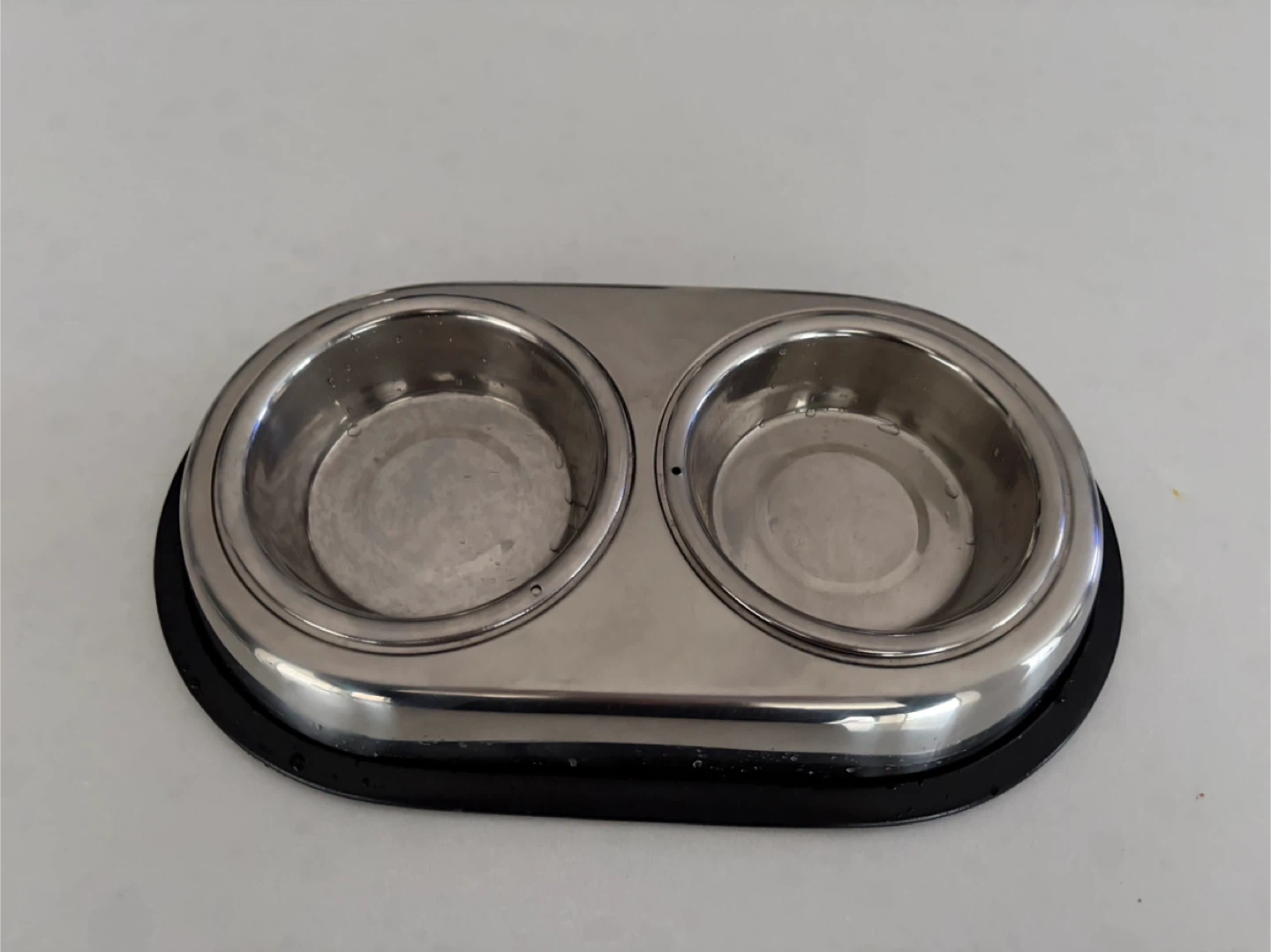 This is a double pet bowl set for food and water. It's made of stainless steel and sits on a non-slip rubber base. The set measures about 13 inches long and each bowl is approximately 3 inches in diameter. It's suitable for cats or small to medium dogs.