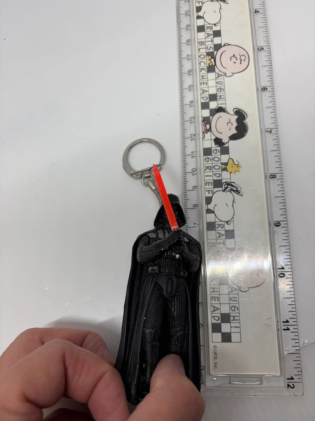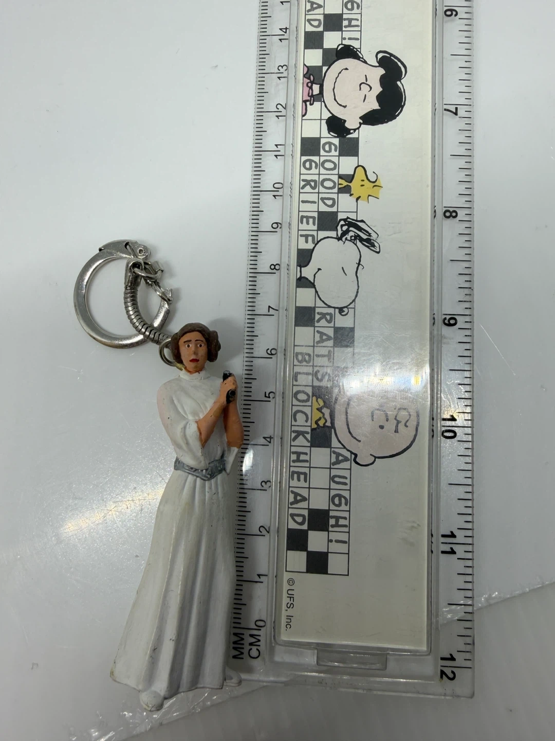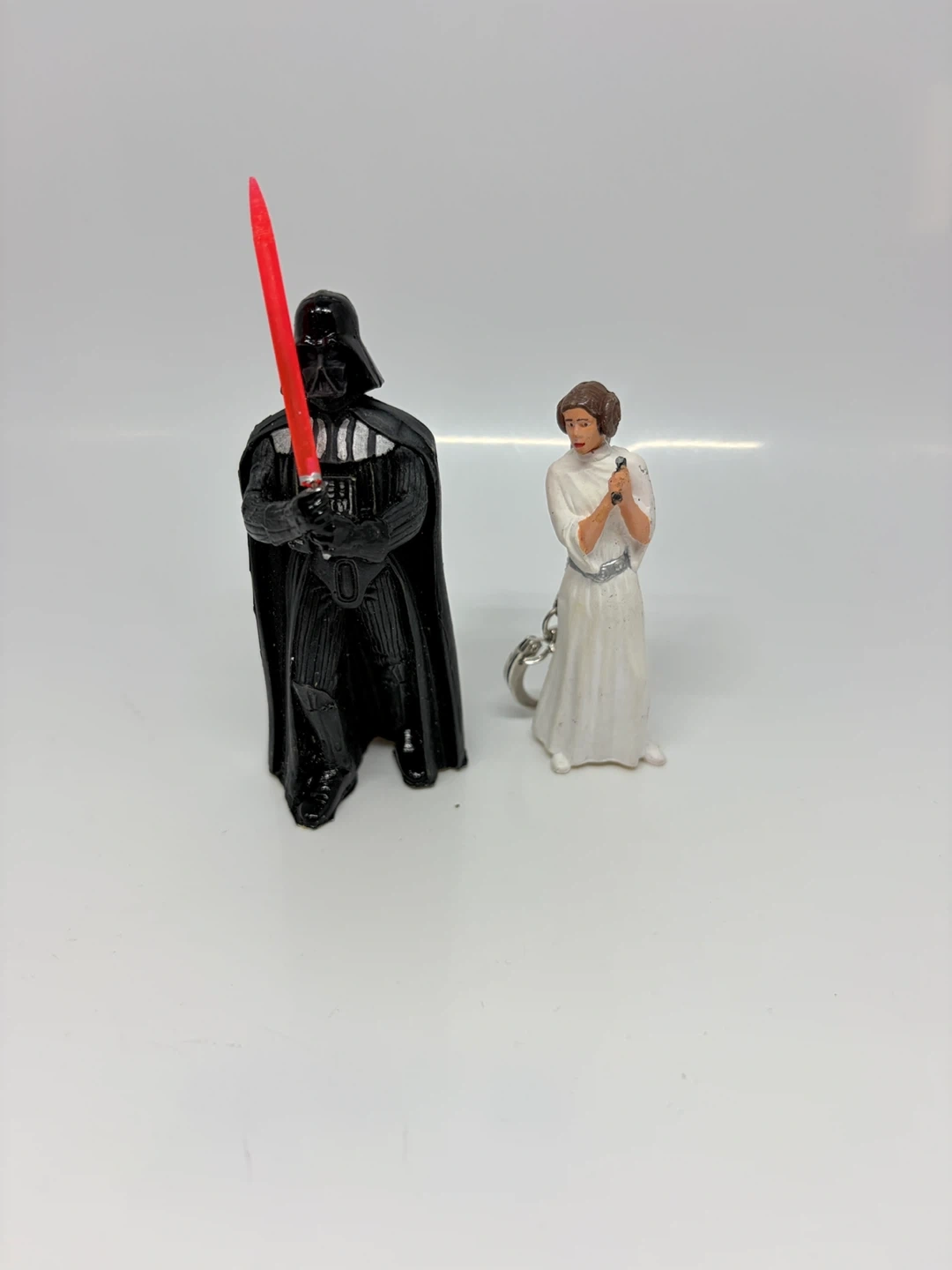 Set of two Star Wars figurines keychains featuring Darth Vader with his lightsaber and Princess Leia. Darth Vader is approximately 4 inches tall. Princess Leia is about 3 inches tall. Great for any Star Wars fan!