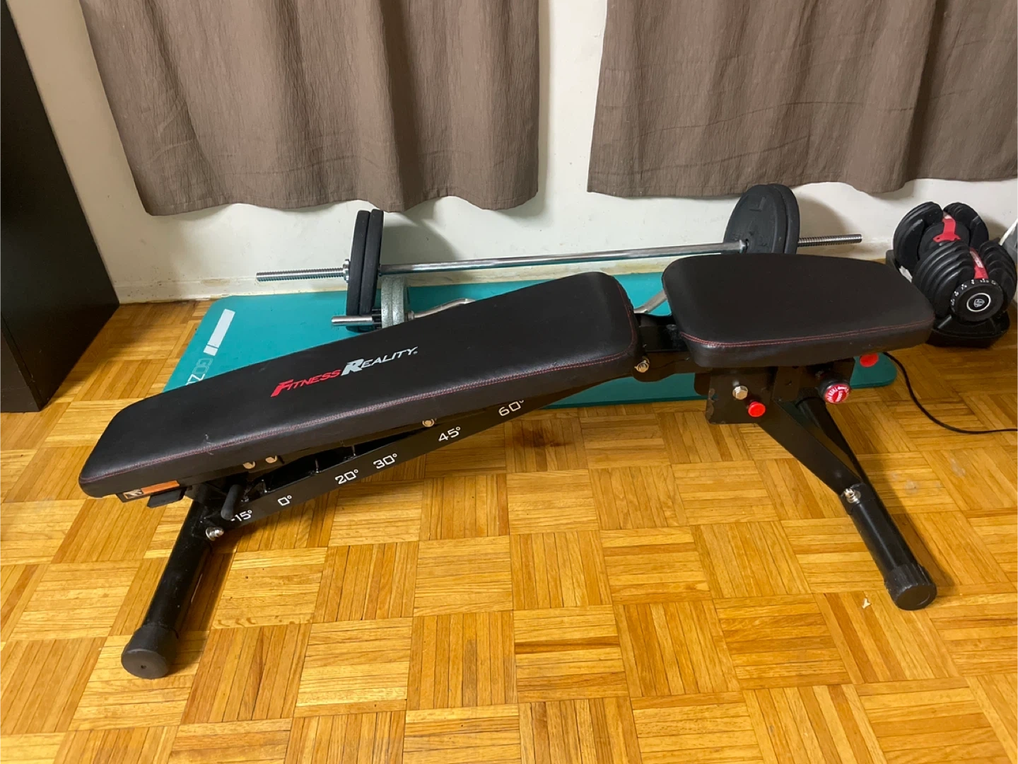 This Fitness Reality weight bench is black with red stitching. Its very heavy and It's made of durable material for your workouts. Use this bench for a variety of strength training exercises at home!