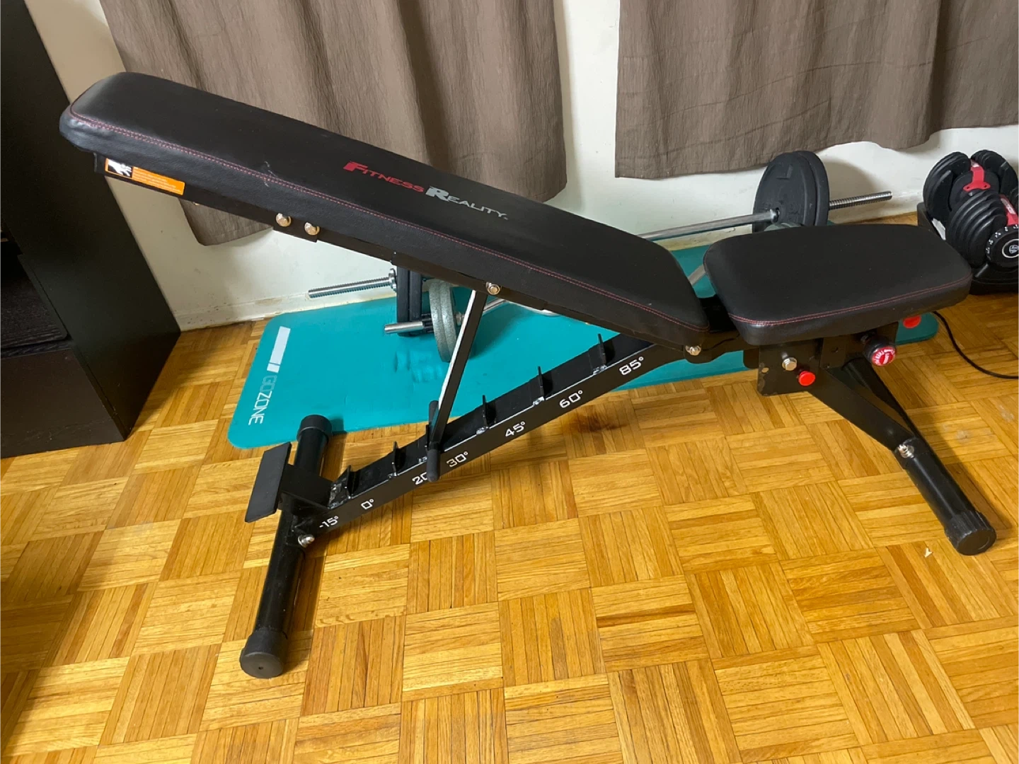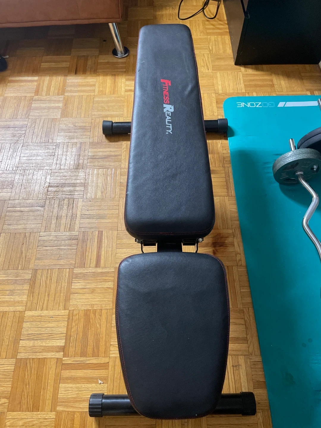 This Fitness Reality weight bench is black with red stitching. Its very heavy and It's made of durable material for your workouts. Use this bench for a variety of strength training exercises at home!