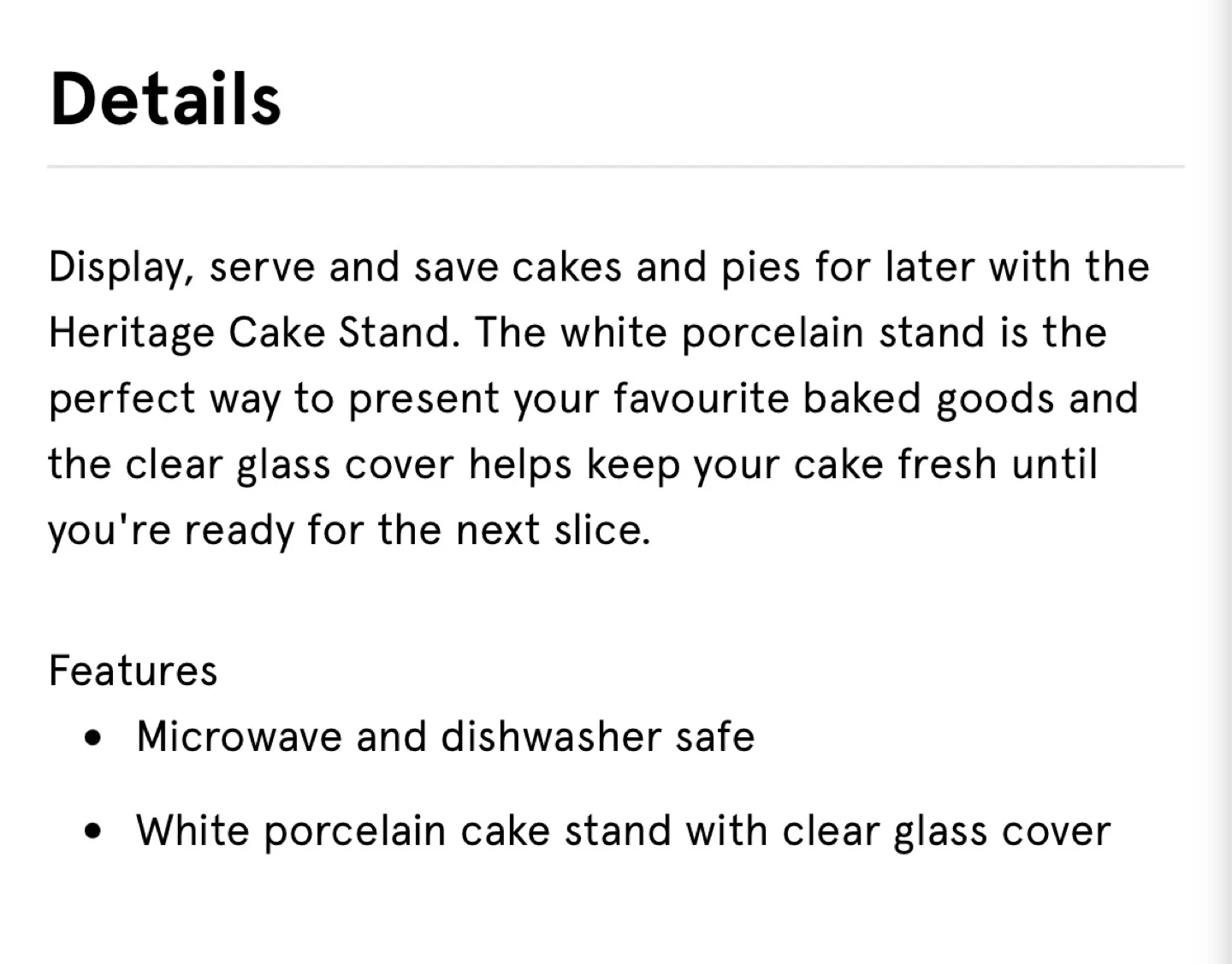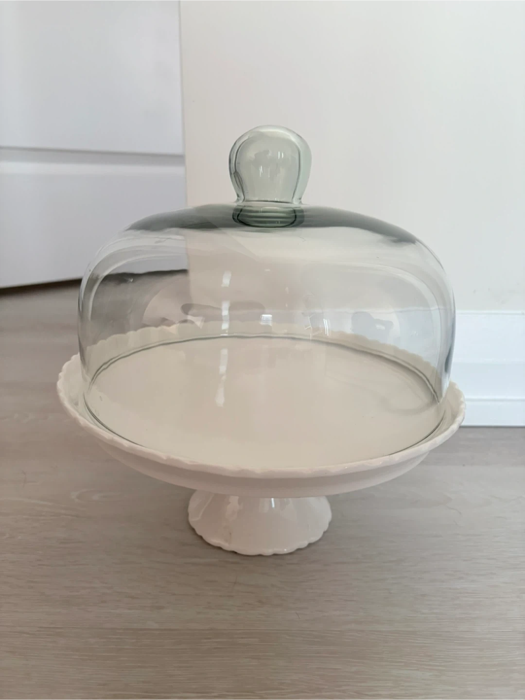 This white porcelain cake stand comes with a clear glass cover. It's 25.5cm high and 25cm in diameter. It's microwave and dishwasher safe!